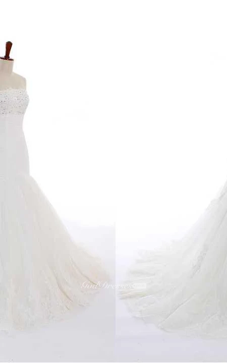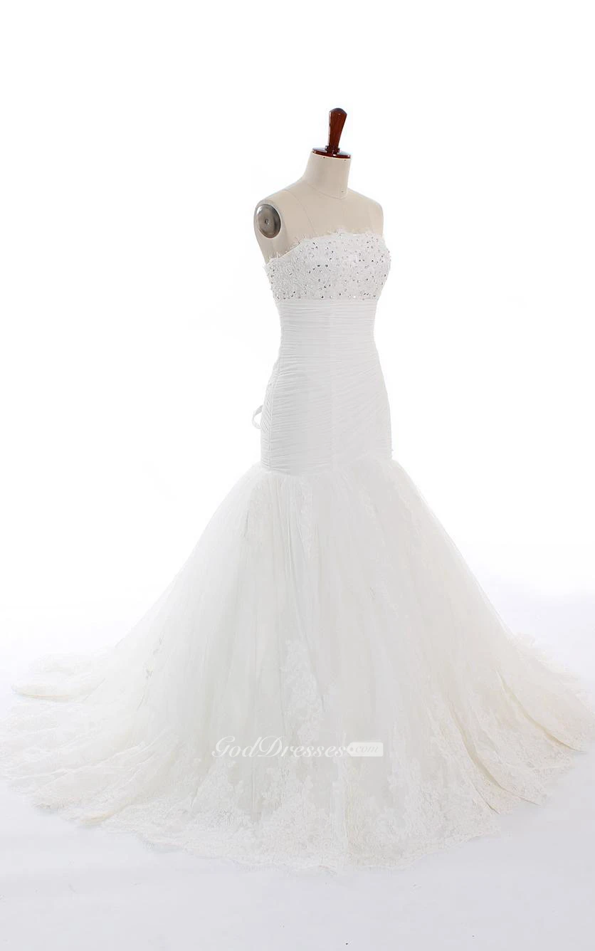 Ball Gown Trumpet Maxi Off-The-Shoulder One-Shoulder Straps Scalloped Sleeveless Bell Pleats Beading Appliques Court Train Lace-Up Back Straps Tulle Lace Organza Dress