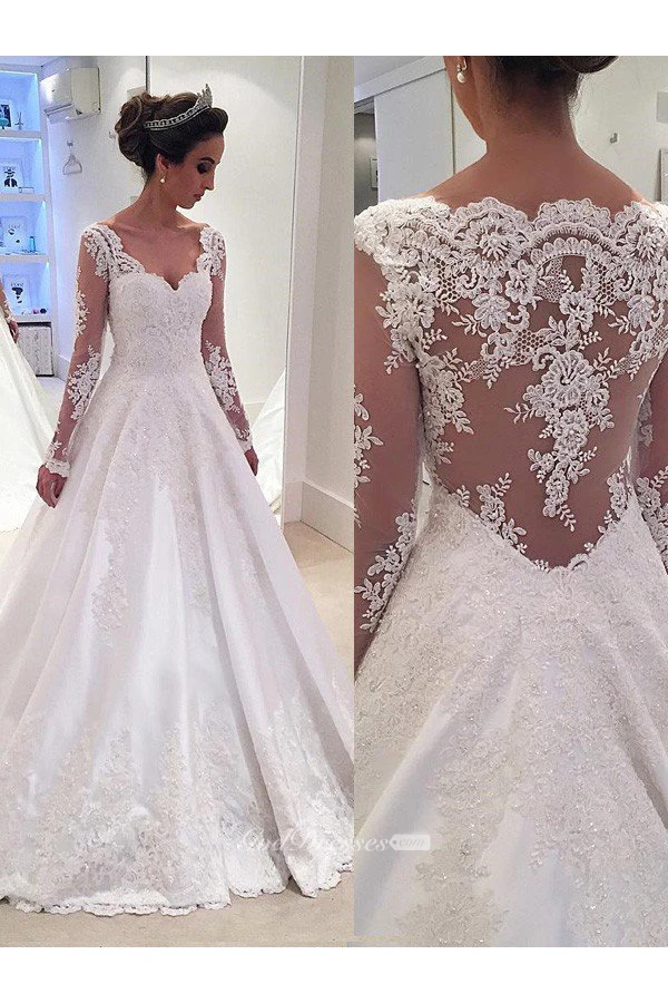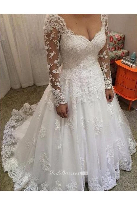 Ball Gown V-neck Long Sleeves Lace Court Train Wedding Dresses