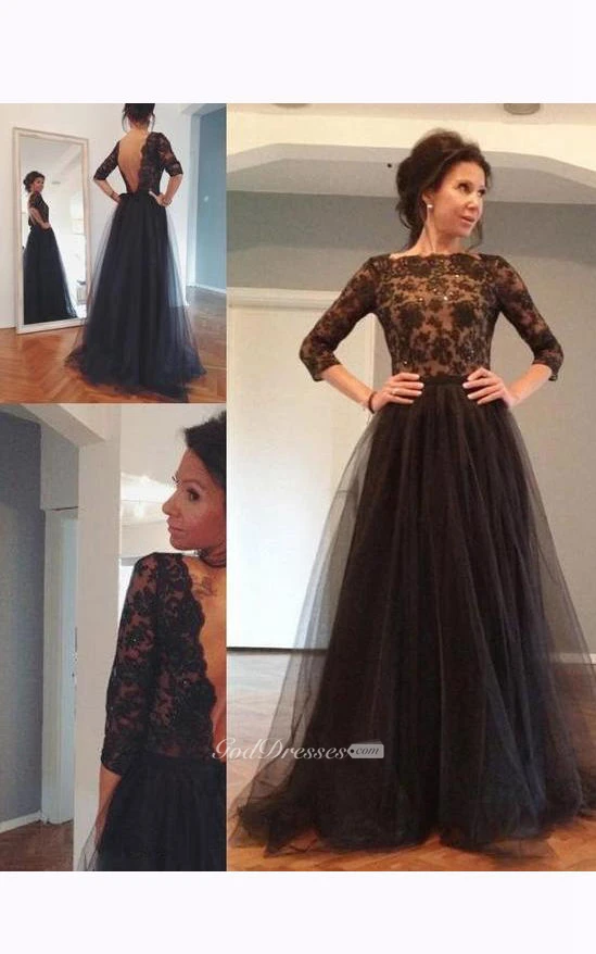Bateau 3-4 Sleeve A-line Tulle Long Dress With Lace Top And Low-v Back