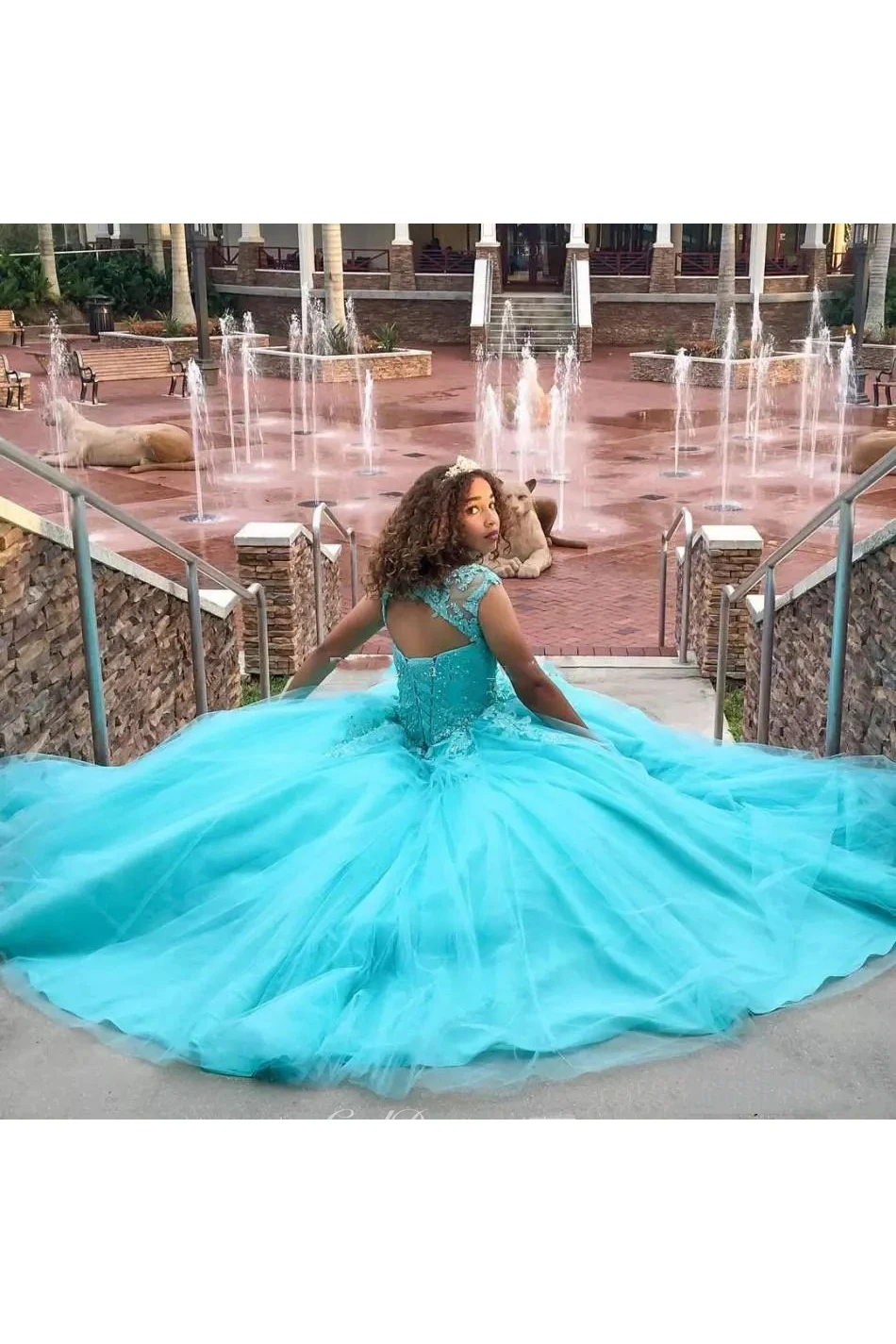 Bateau Cap Short Sleeve Brush Train Lace Tulle Ball Gown Dress