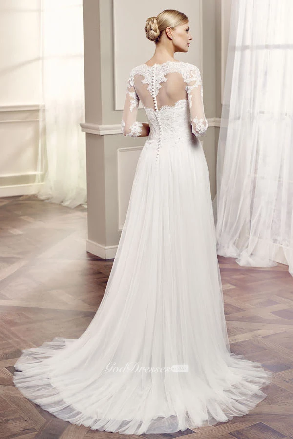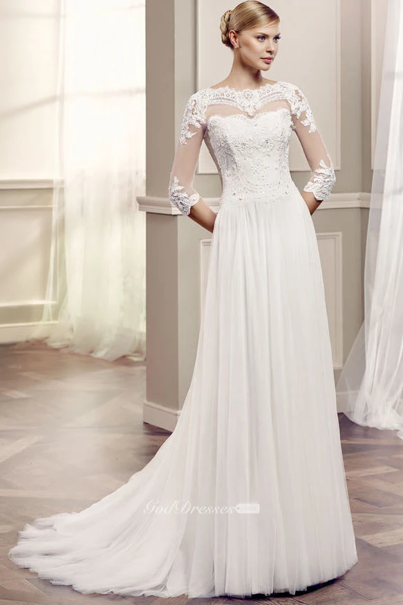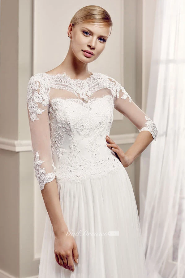Bateau Floor-Length Beaded Half Sleeve Tulle Wedding Dress