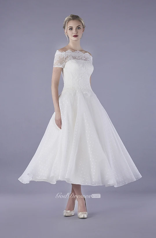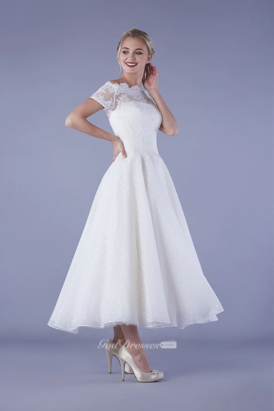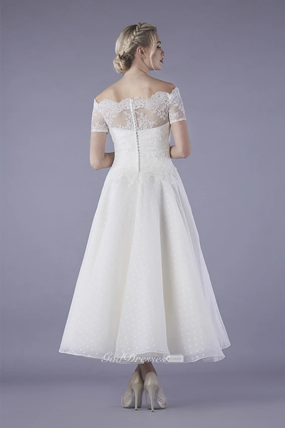 Bateau Illusion Lace Ankle Length Vintage Tulle Wedding Dress With Buttons