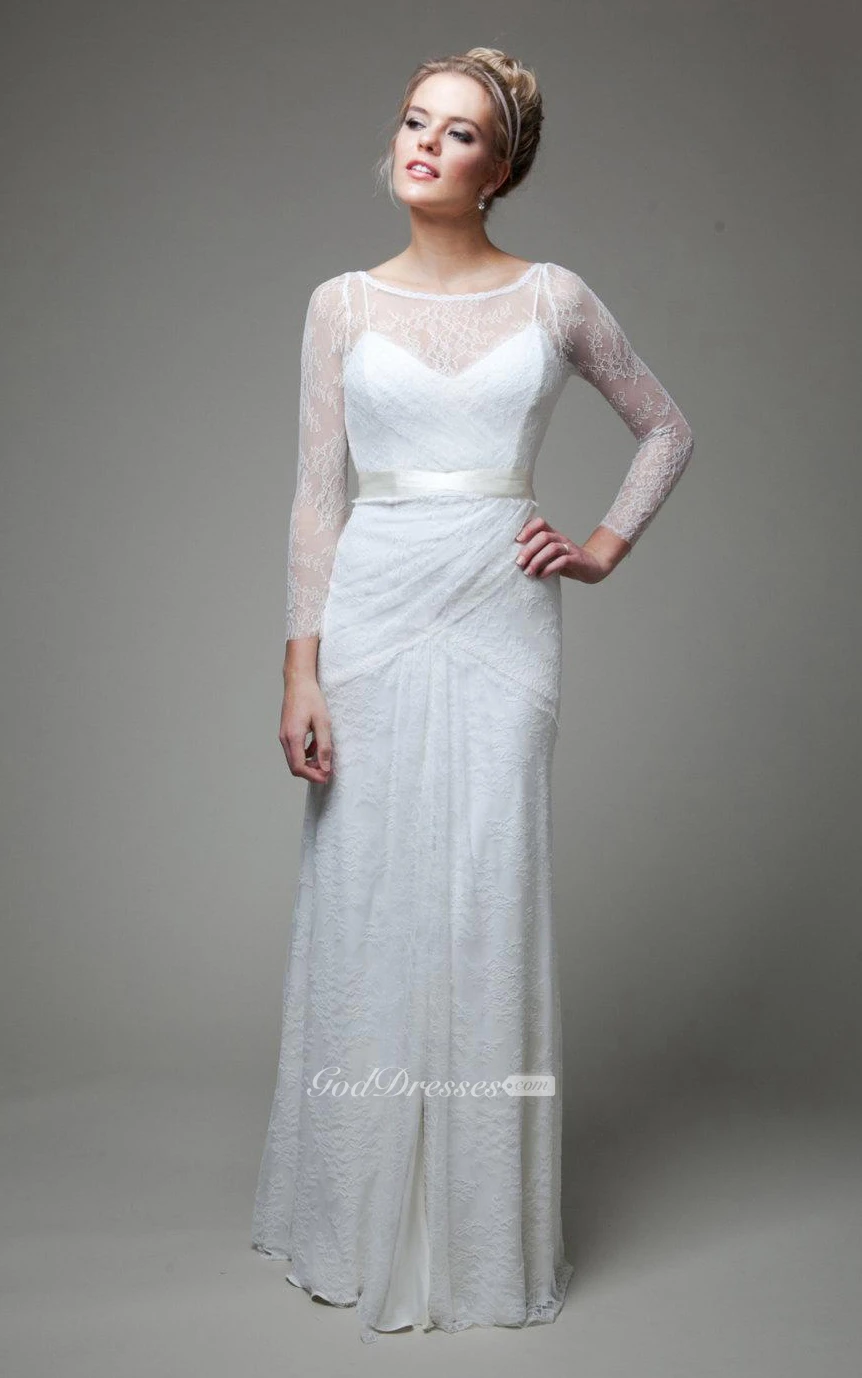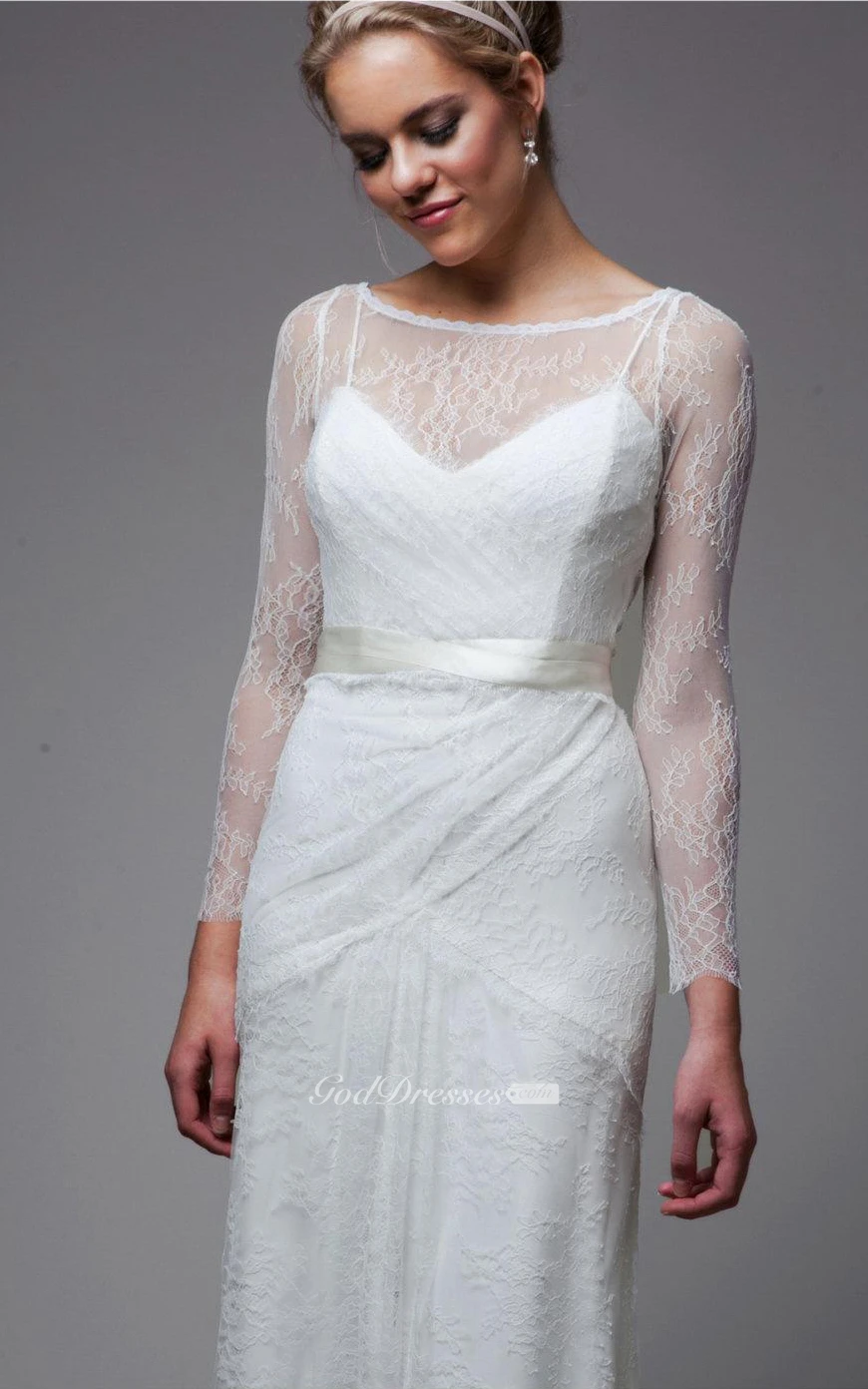 Bateau Illusion Sleeve Sheath Lace Wedding Dress With Sash And Low-V Back