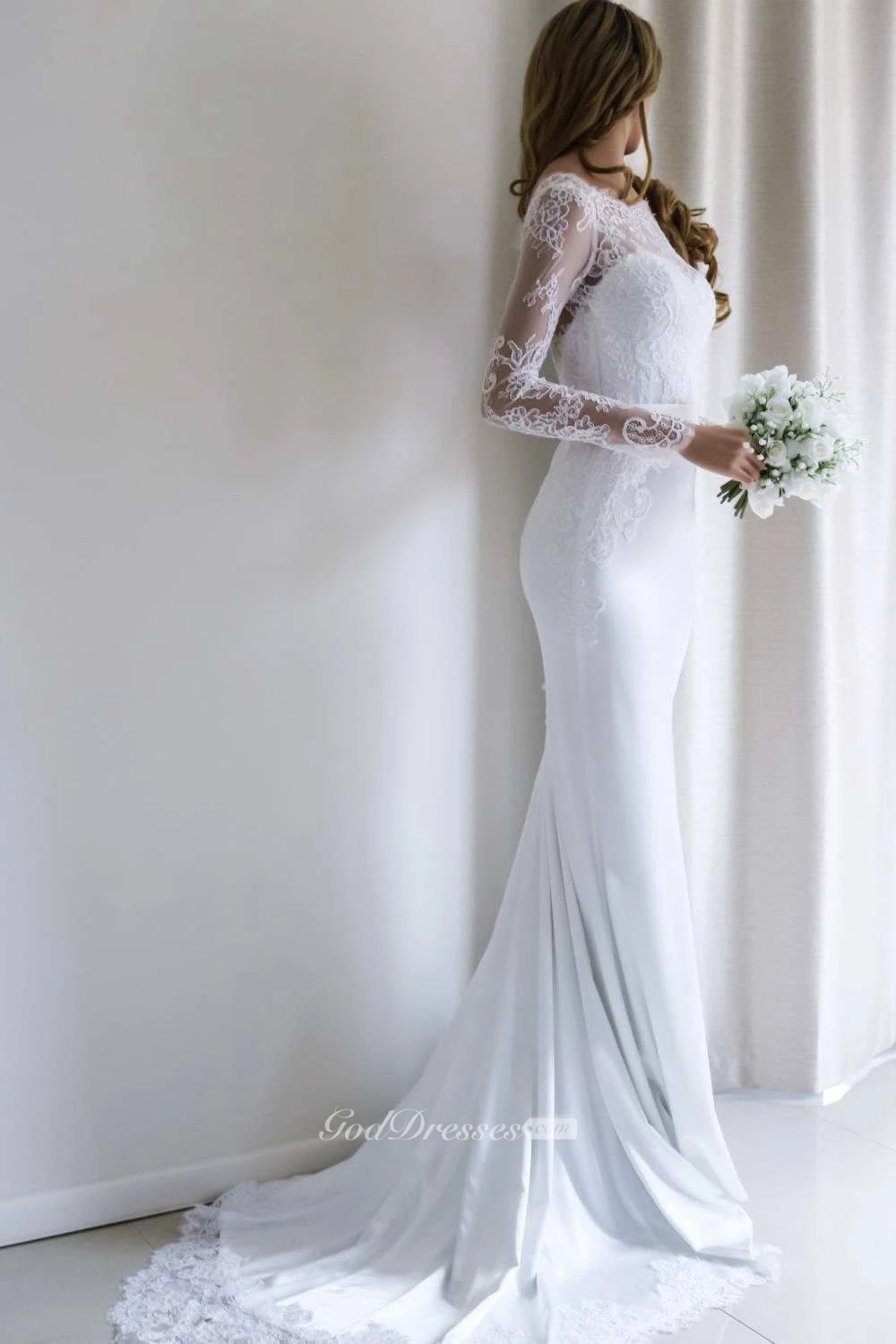 Bateau Lace Long Sleeve Sheath Chiffon Wedding Dress With Sweep Train