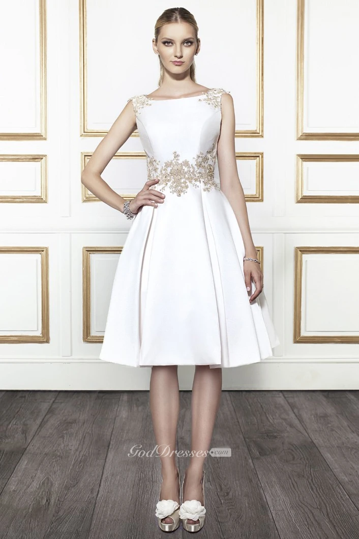 Bateau Midi Appliqued Satin Wedding Dress With V Back
