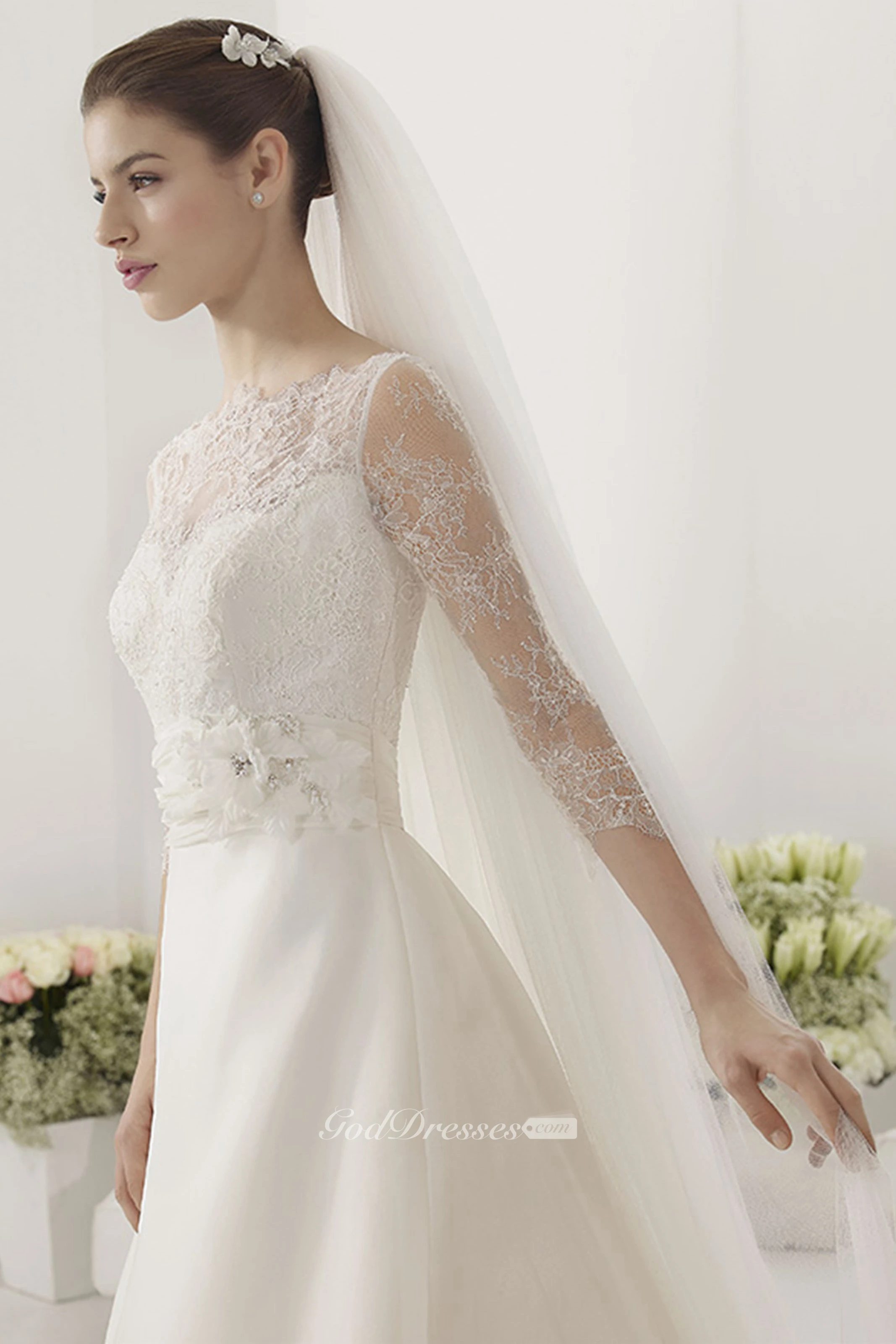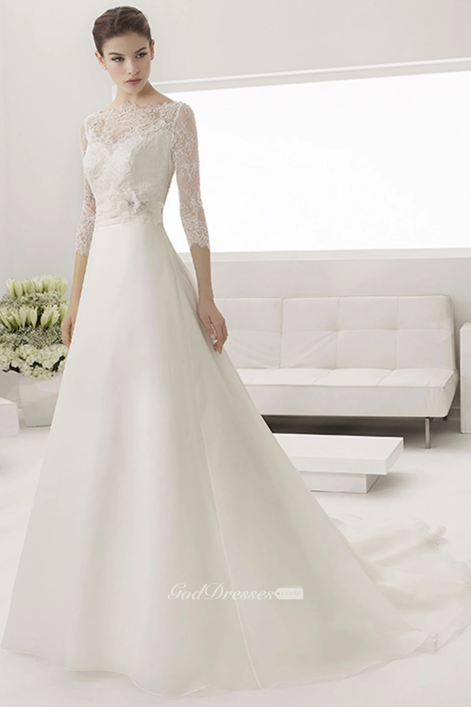 Bateau Neck 3-4 Illusion Sleeve A-Line Gown With Flower