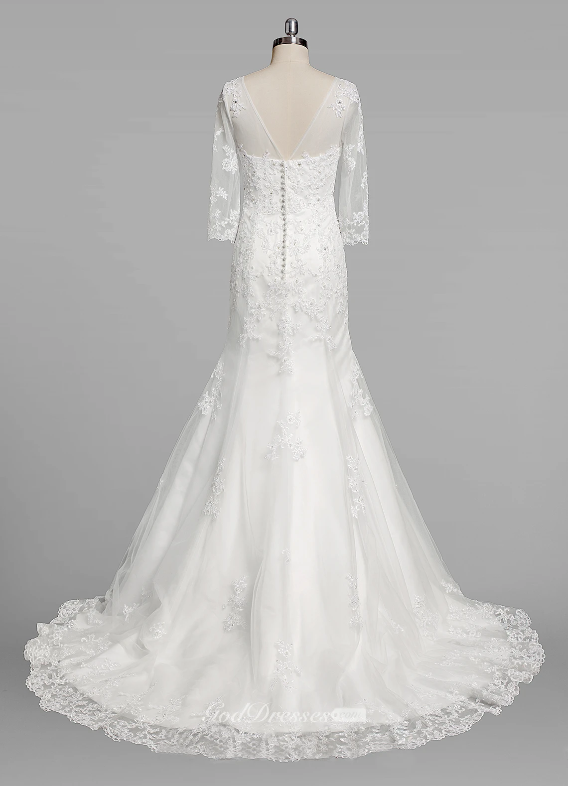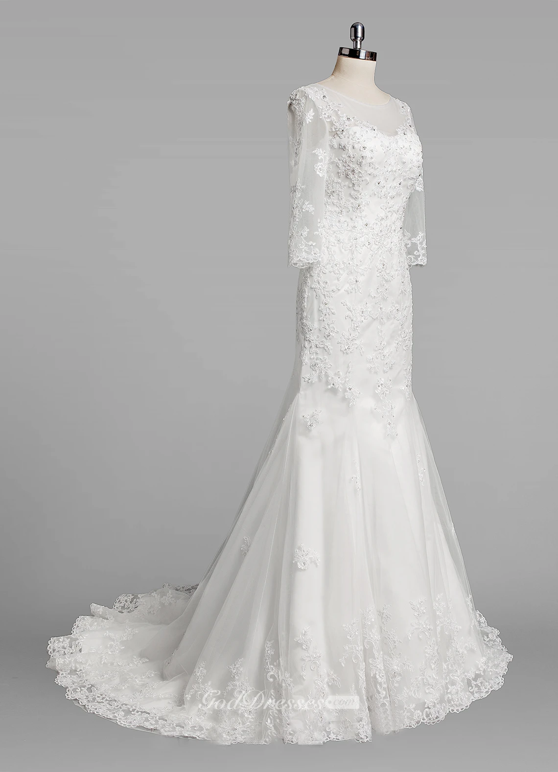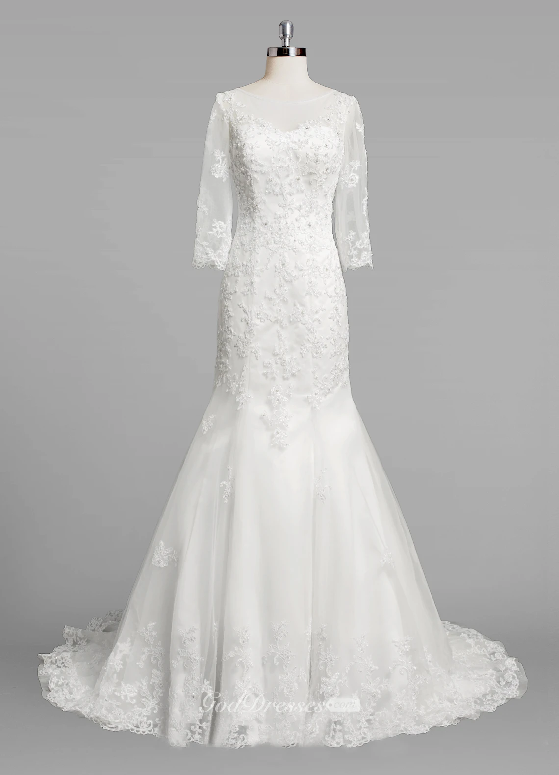 Bateau Neck 3-4 Sleeve Mermaid Lace Wedding Dress With Beading