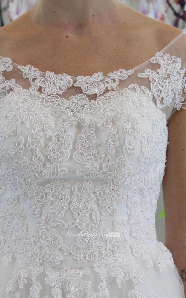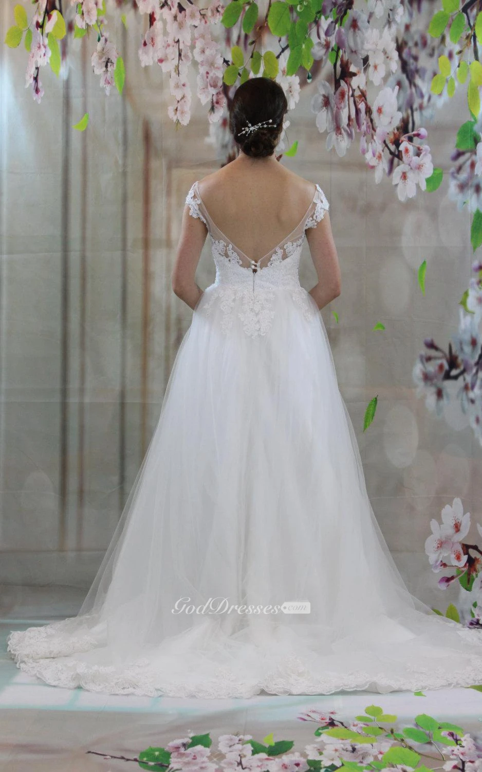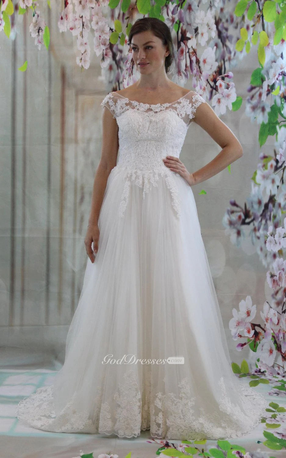 Bateau Neck Cap Sleeve A-Line Lace and Tulle Dress With Low-V Back
