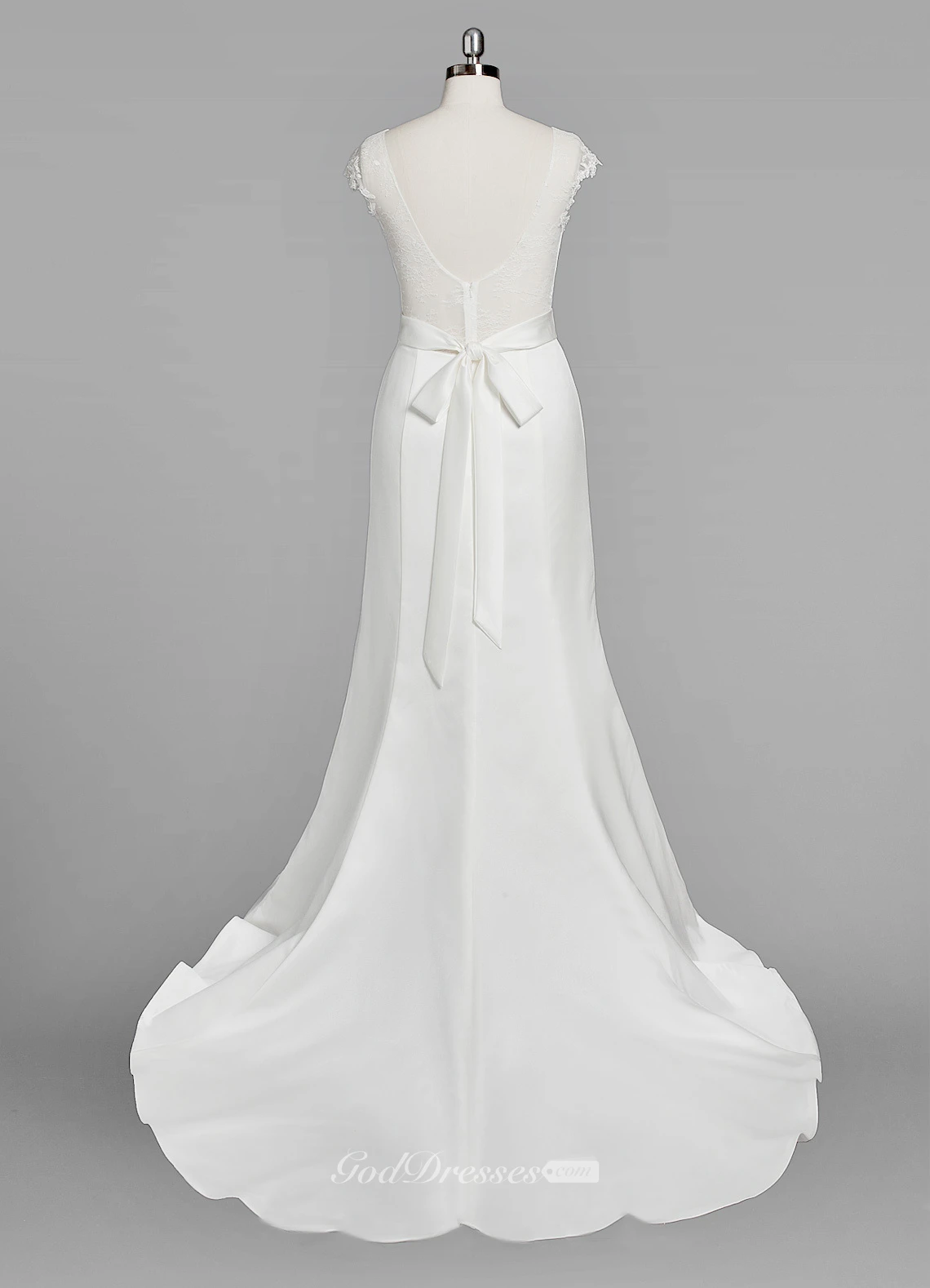 Bateau Neck Cap Sleeve Mermaid Satin Wedding Dress With Ruching