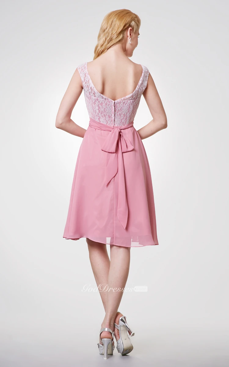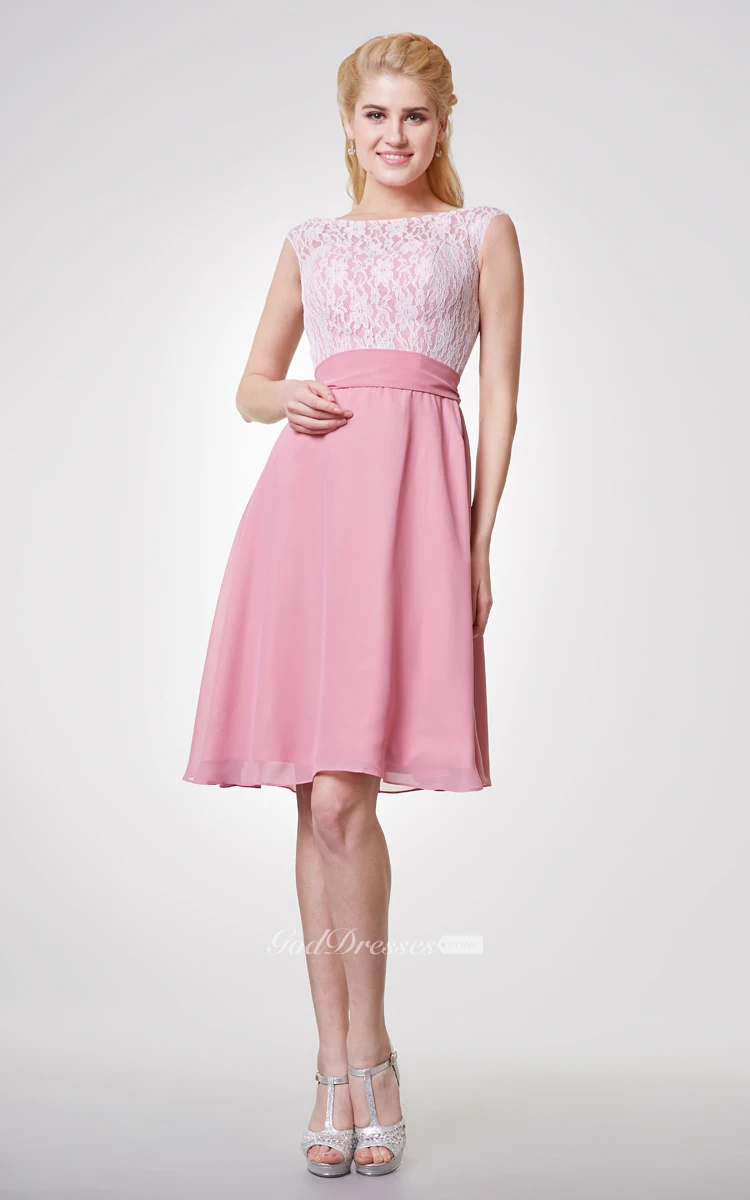 Bateau Neck Cap-sleeved Short Chiffon Dress With Lace Bodice