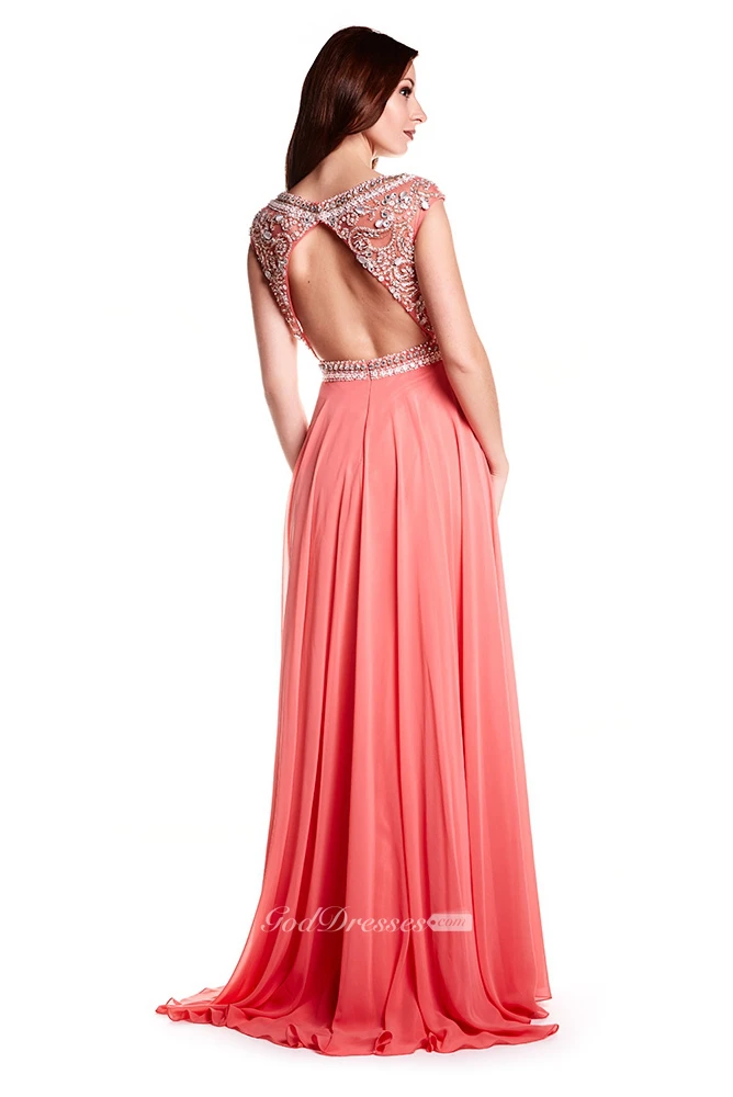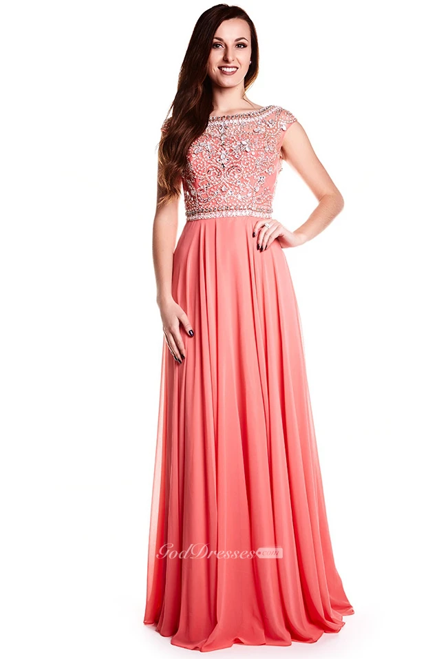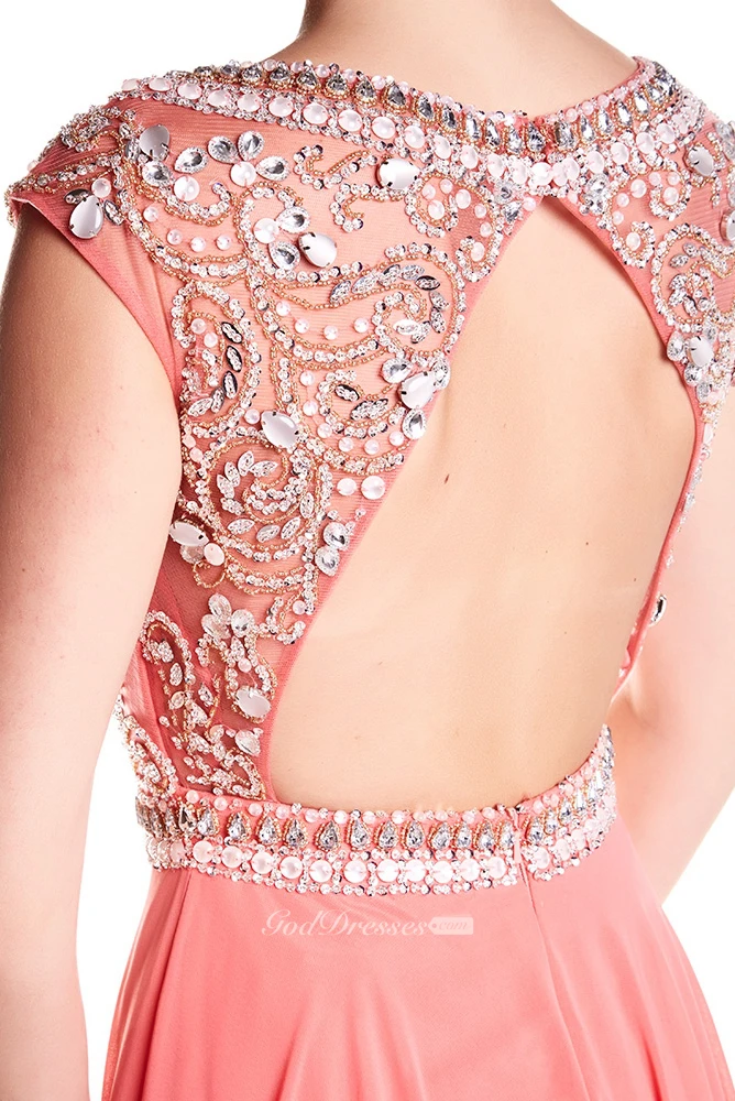 Bateau Neck Crystal Cap Sleeve Chiffon Prom Dress With Keyhole