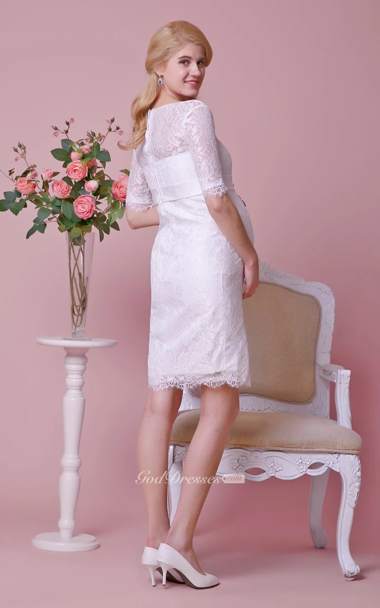 Bateau Neck Half-sleeved Lace Sheath Knee Length Dress With Satin Sash