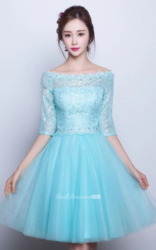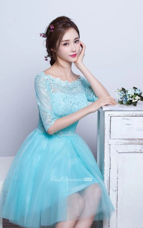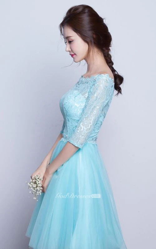 Bateau Neck Half Sleeves Lace Beaded Prom Dress
