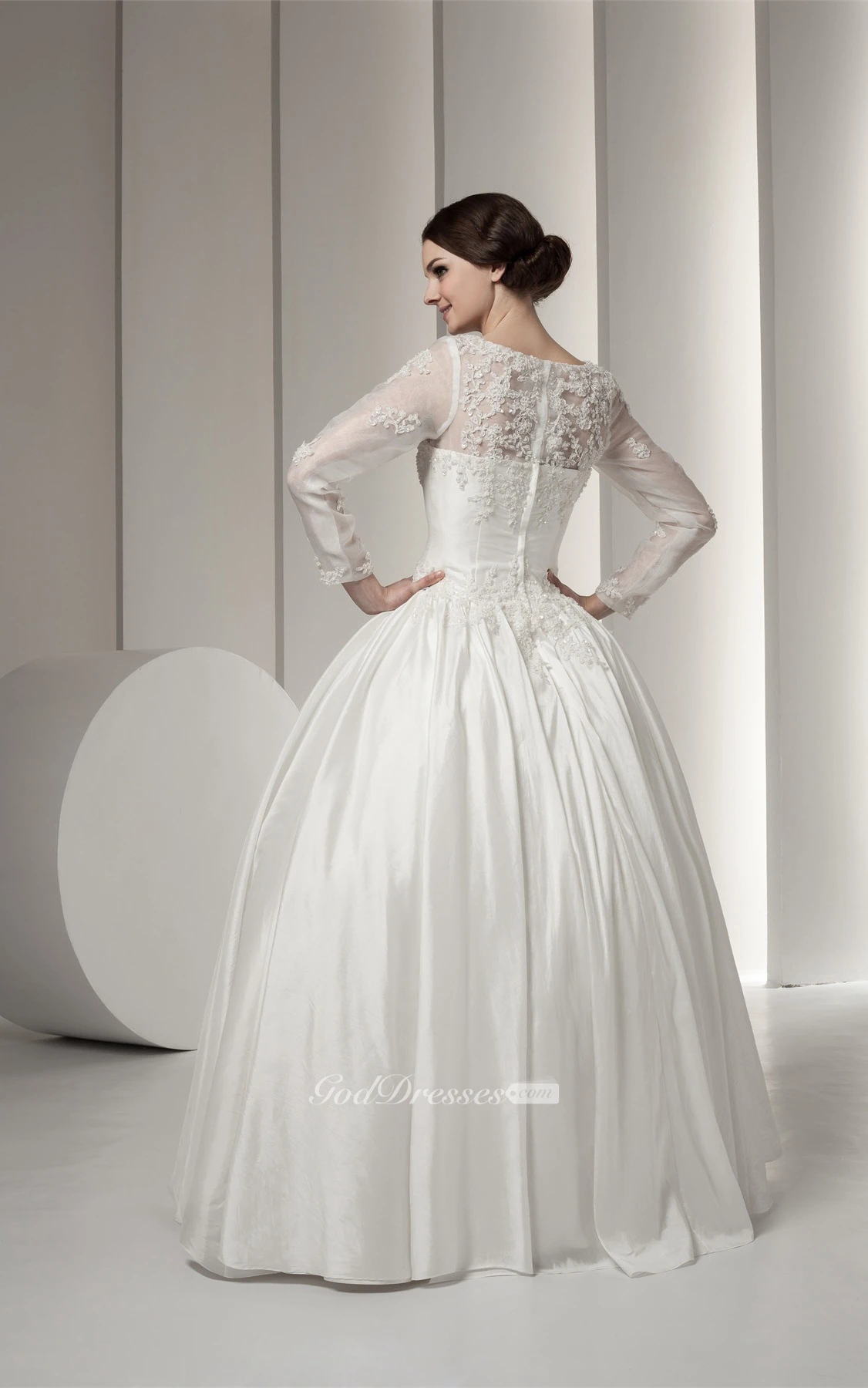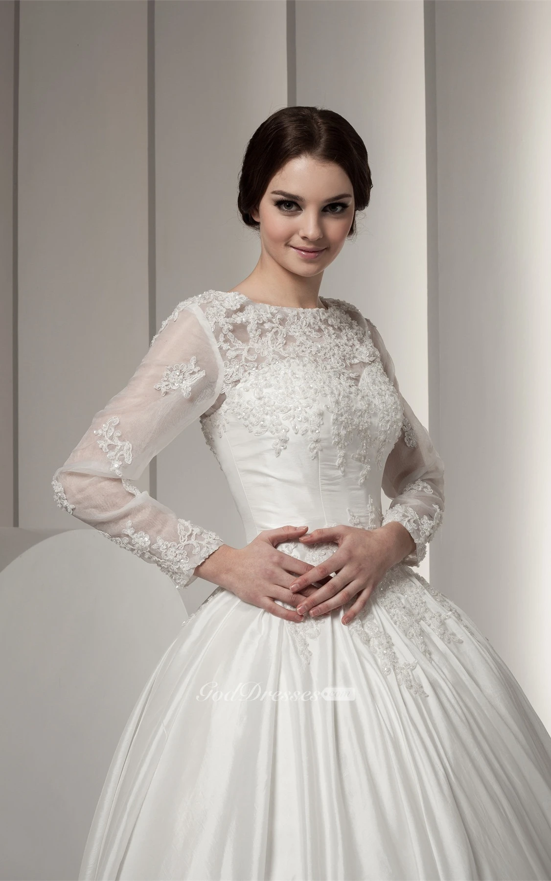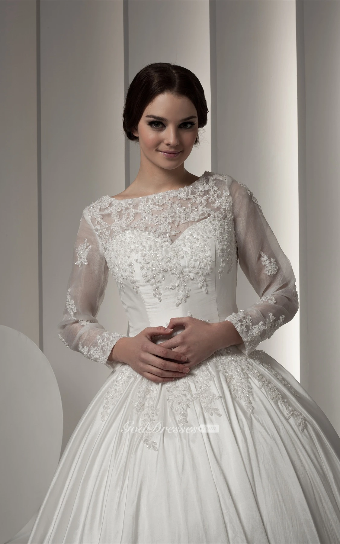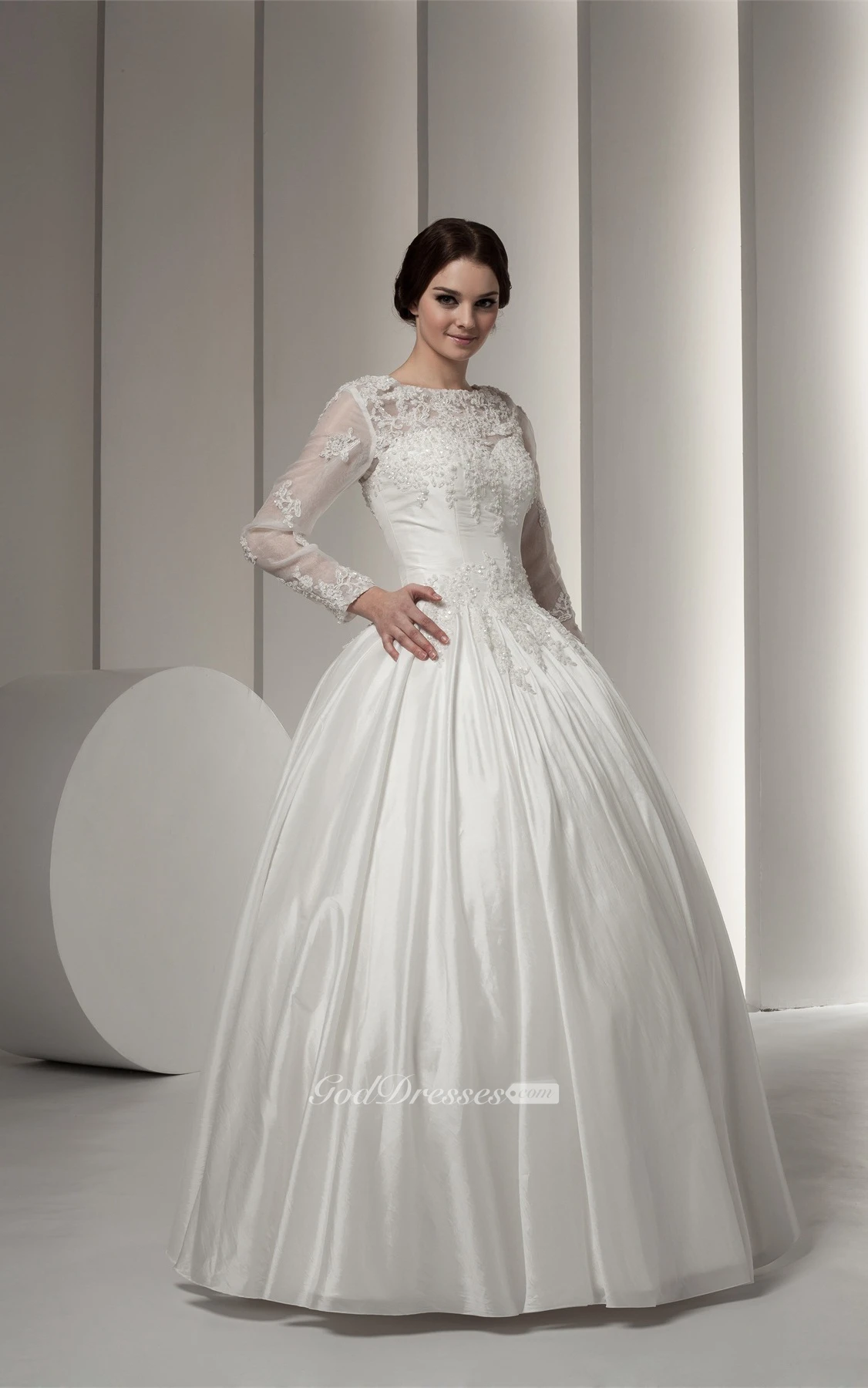 Bateau-Neck Long-Sleeve Beading and Ball-Gown With Lace
