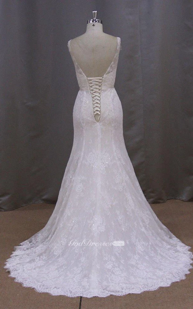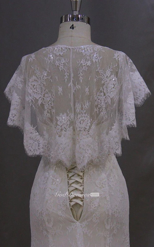 Bateau Neck Mermaid Lace Dress With Lace-Up Back and Cape