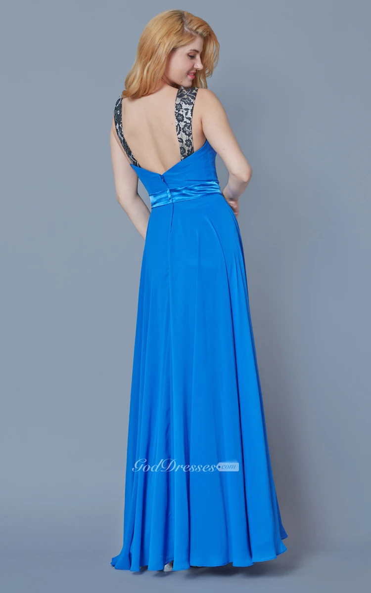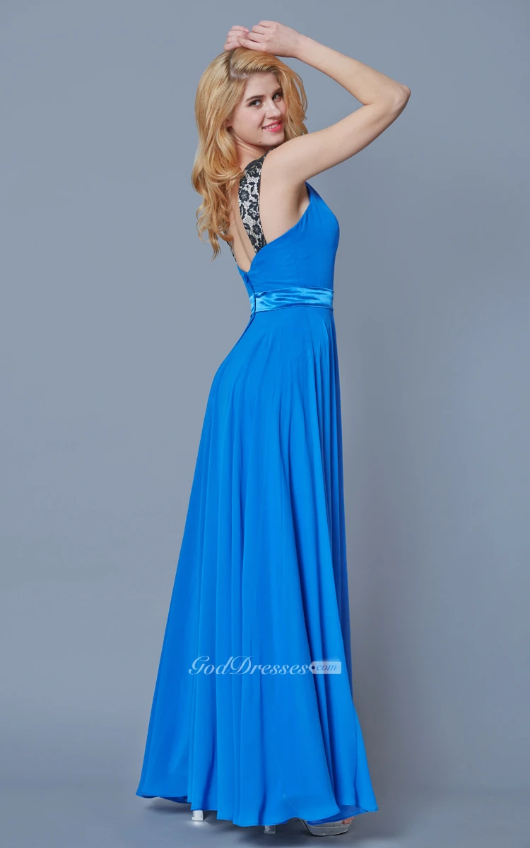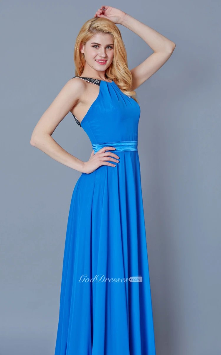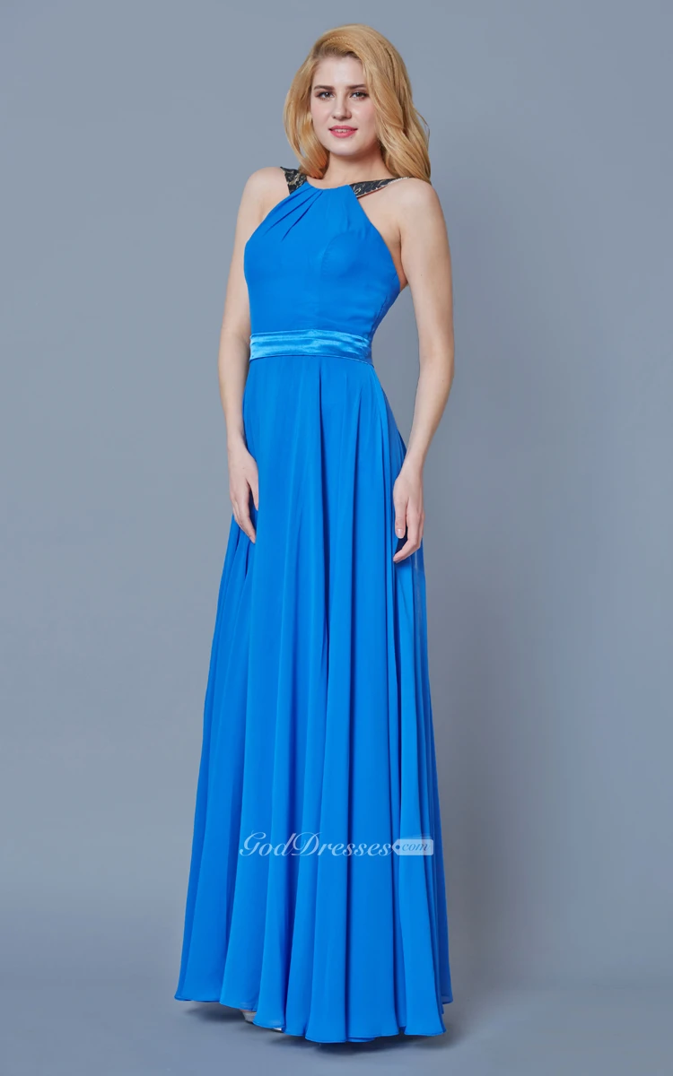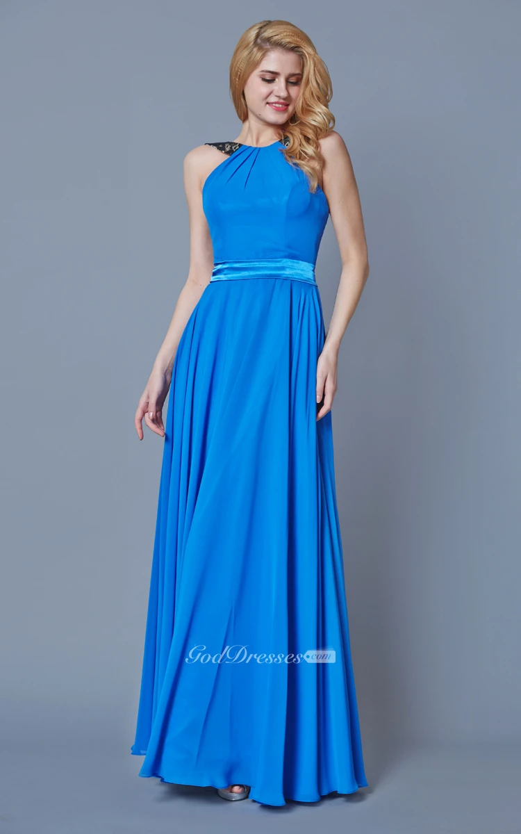 Bateau Neck Pleated Long Chiffon Dress With Satin Belt