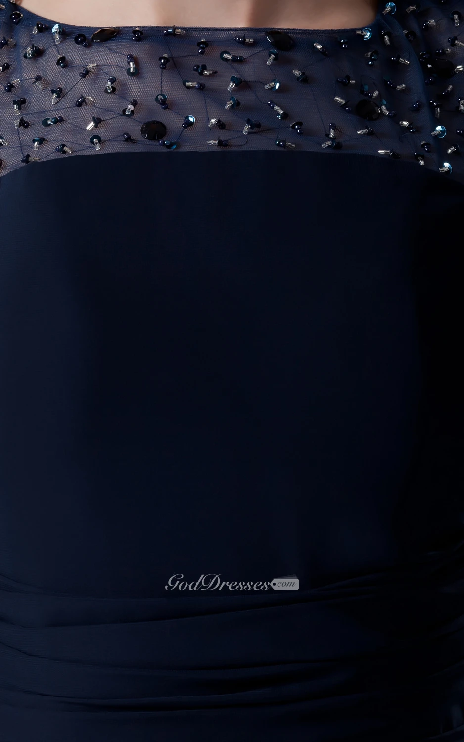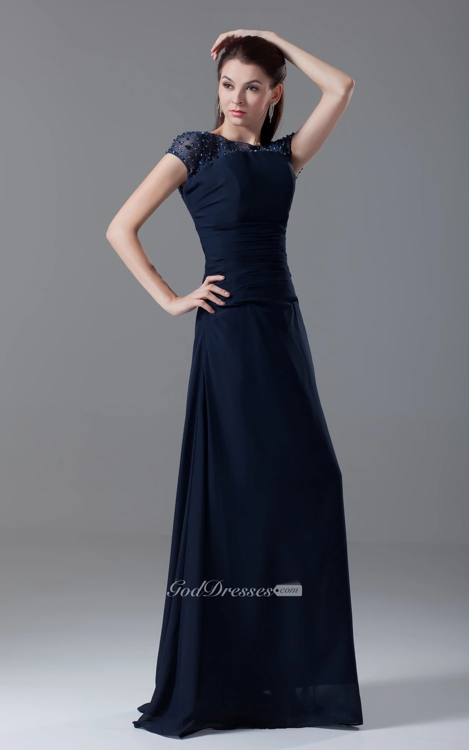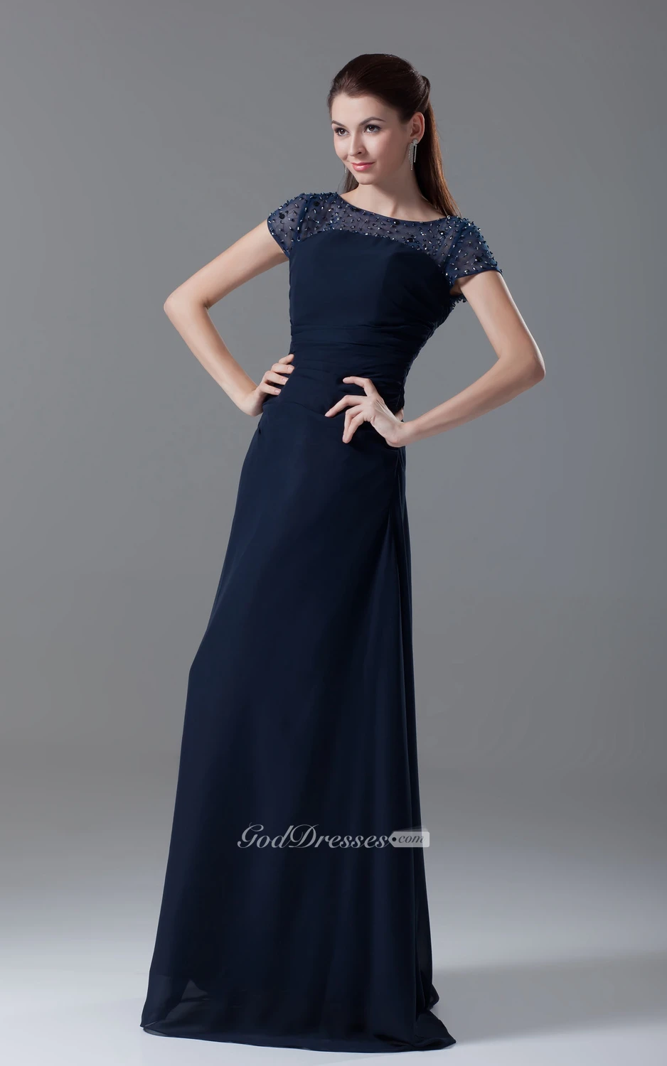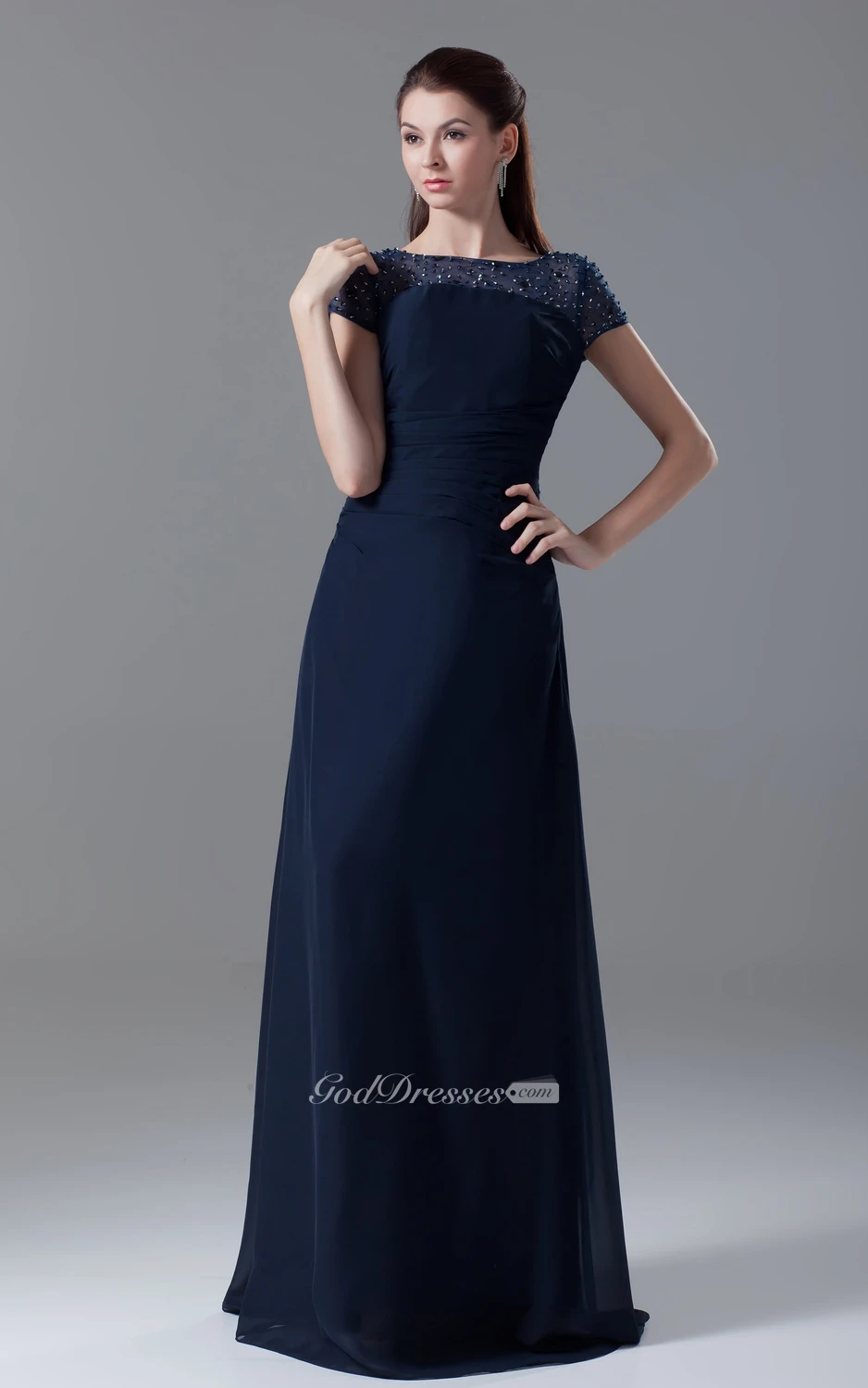 Bateau-Neck Short-Sleeve Floor-Length Chiffon Dress With Beading