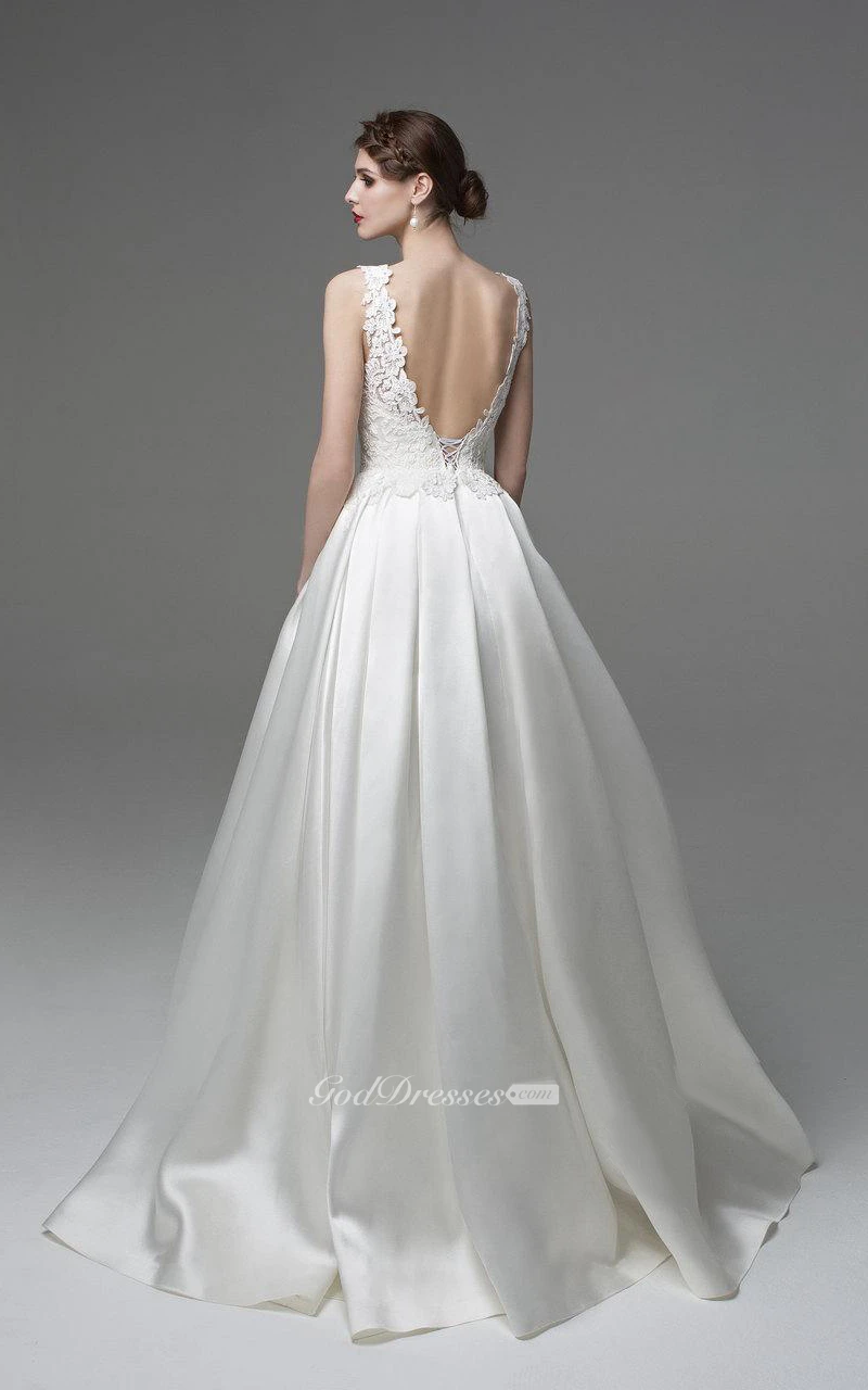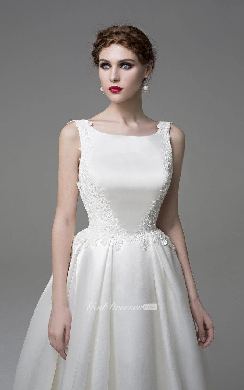 Bateau Neck Sleeveless A-Line Satin Dress With Lace Appliques