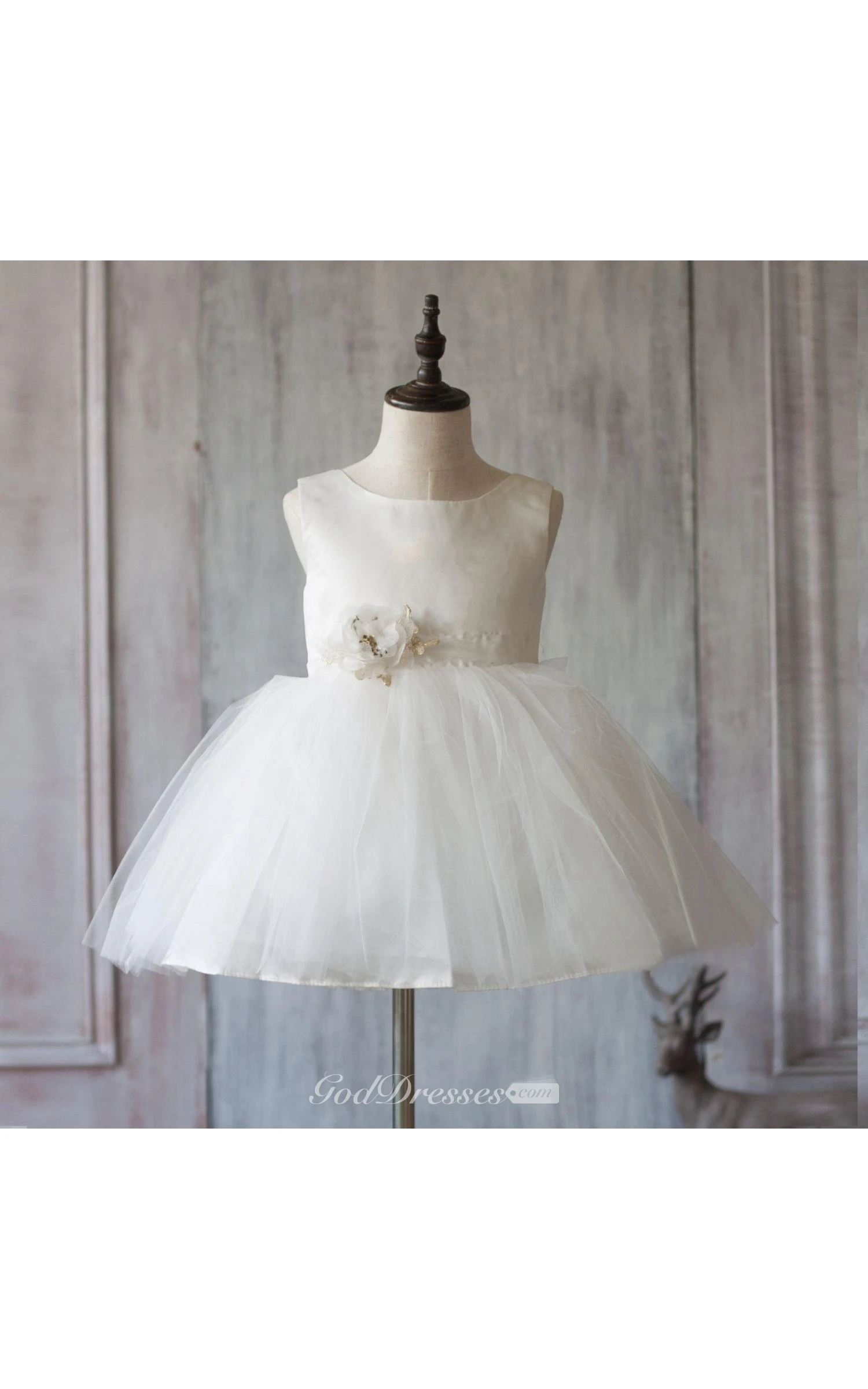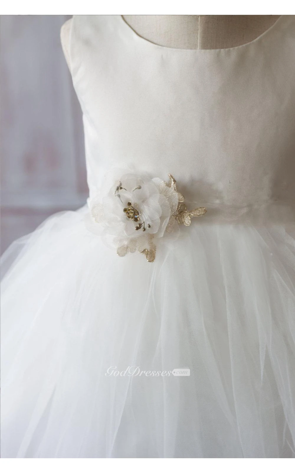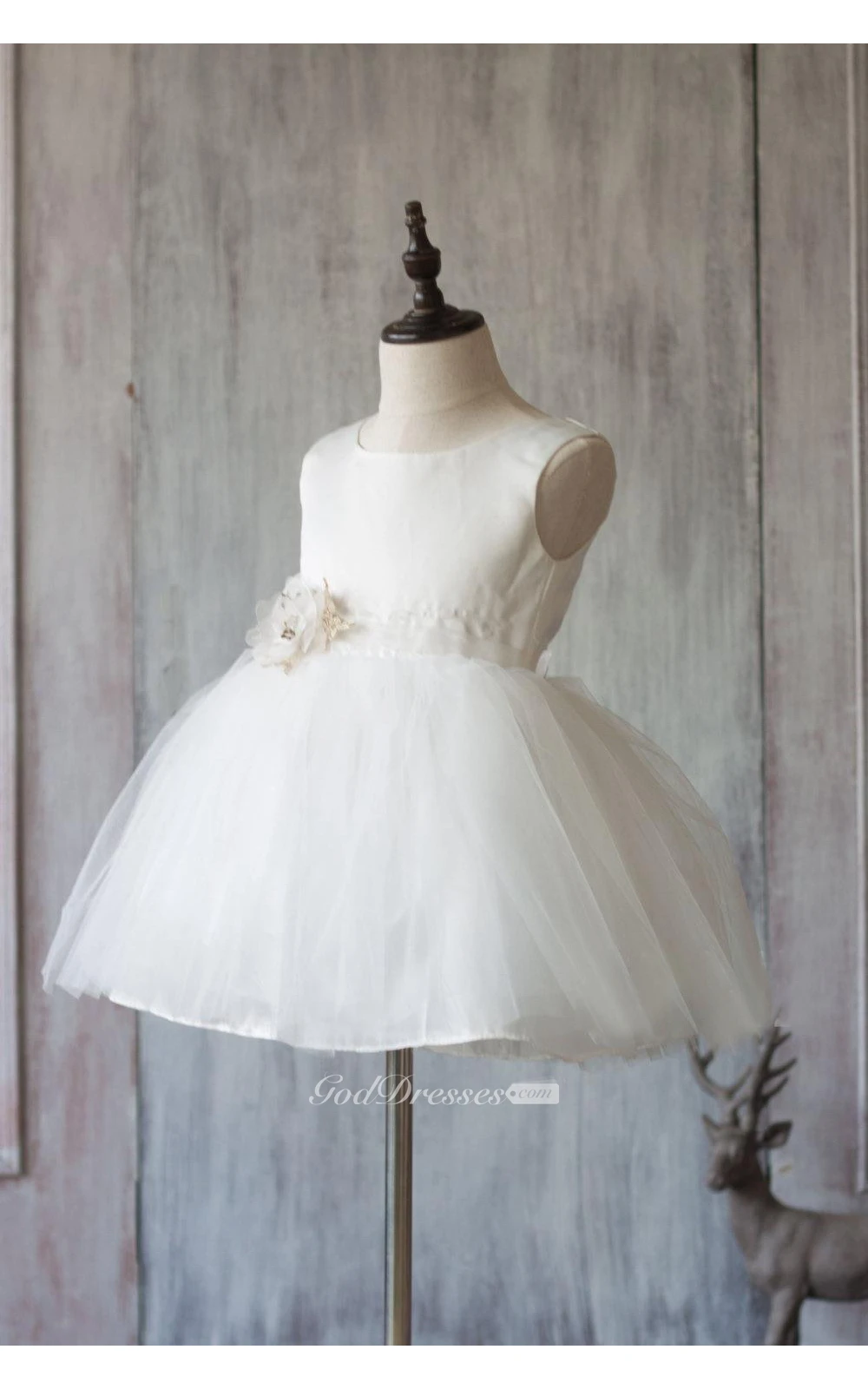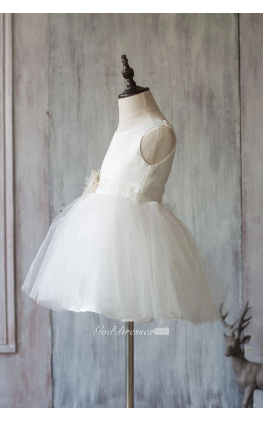 Bateau Neck Sleeveless Knee Length A-line Tulle Dress With Waist Flower