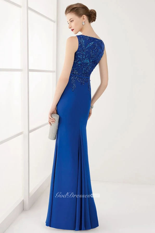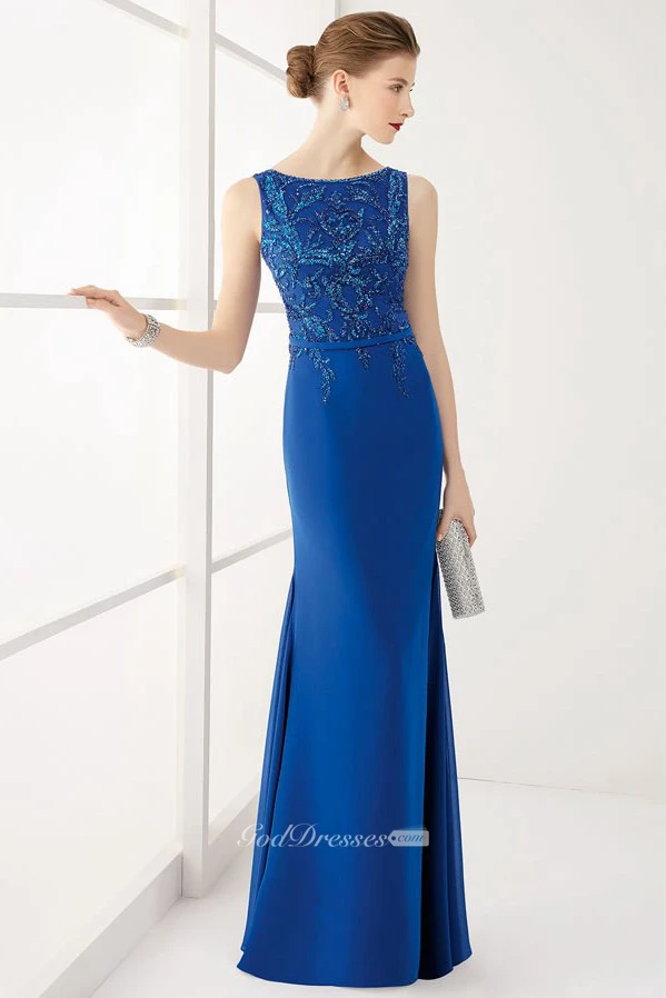 Bateau Neck Sleeveless Sheath Long Prom Dress With Crystal Top And Belt