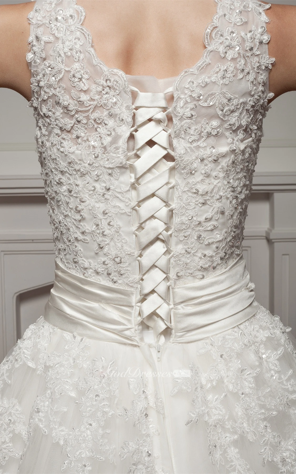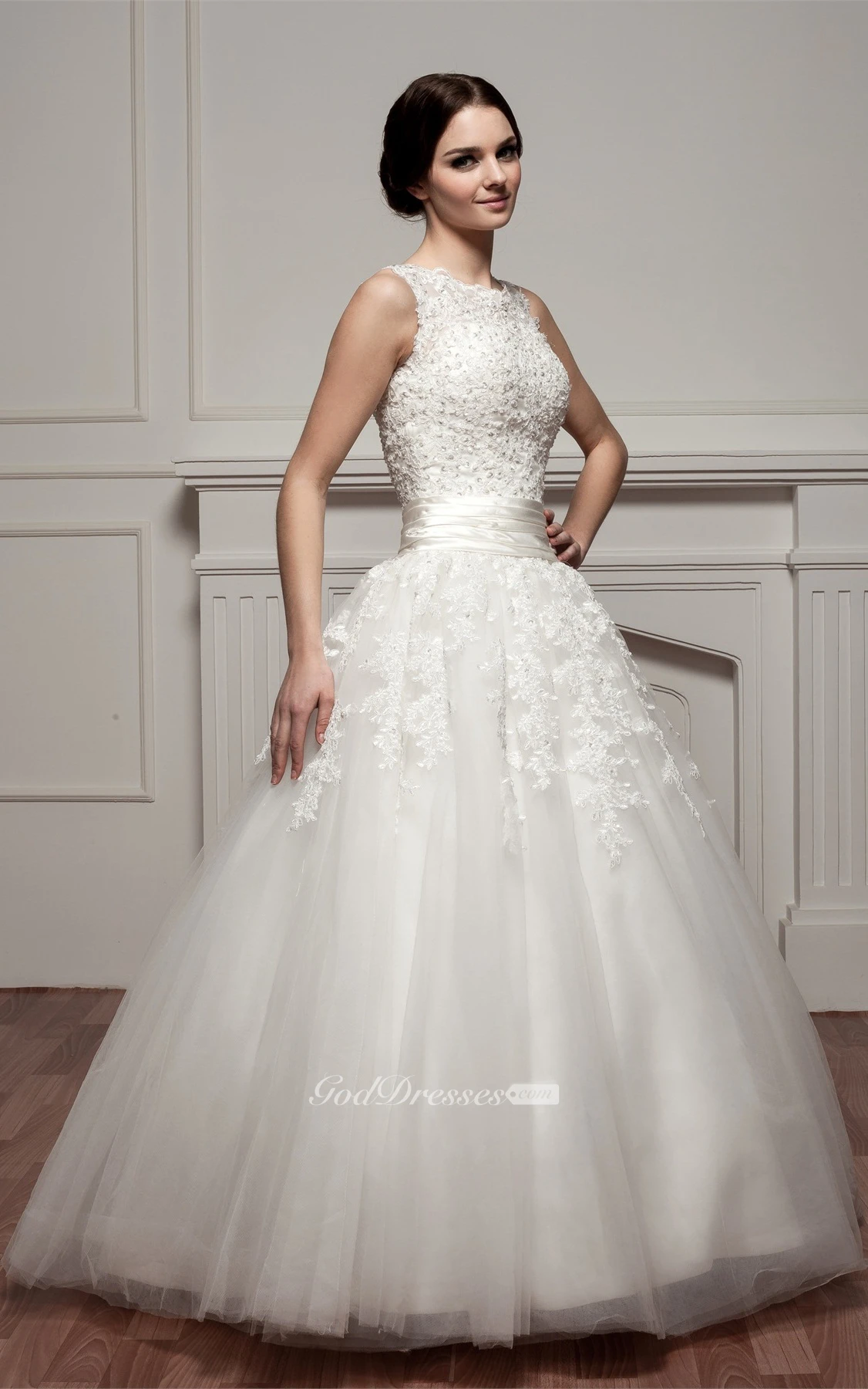 Bateau-Neck Sleeveless Tulle Overlay and Ball-Gown With Appliques