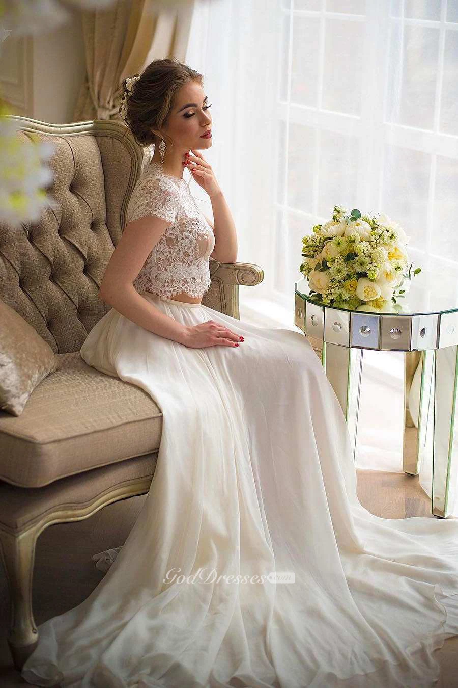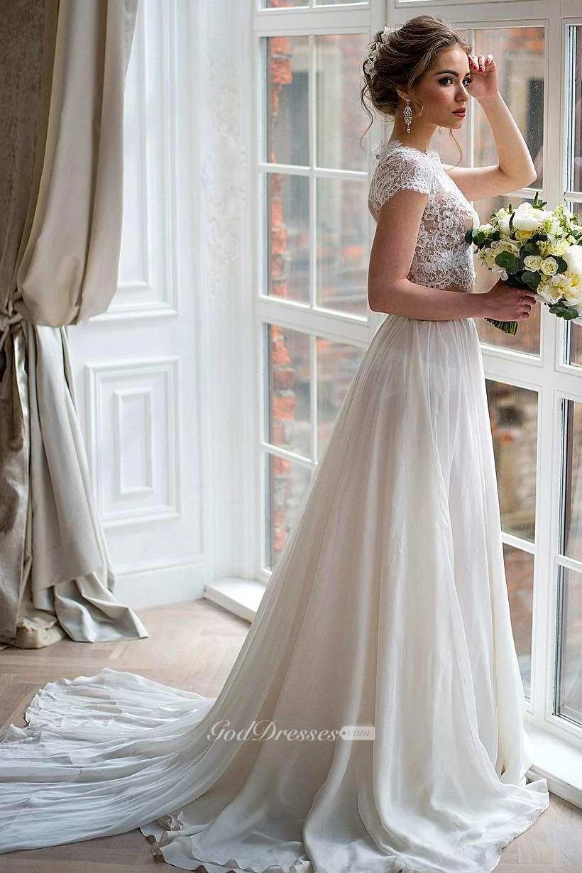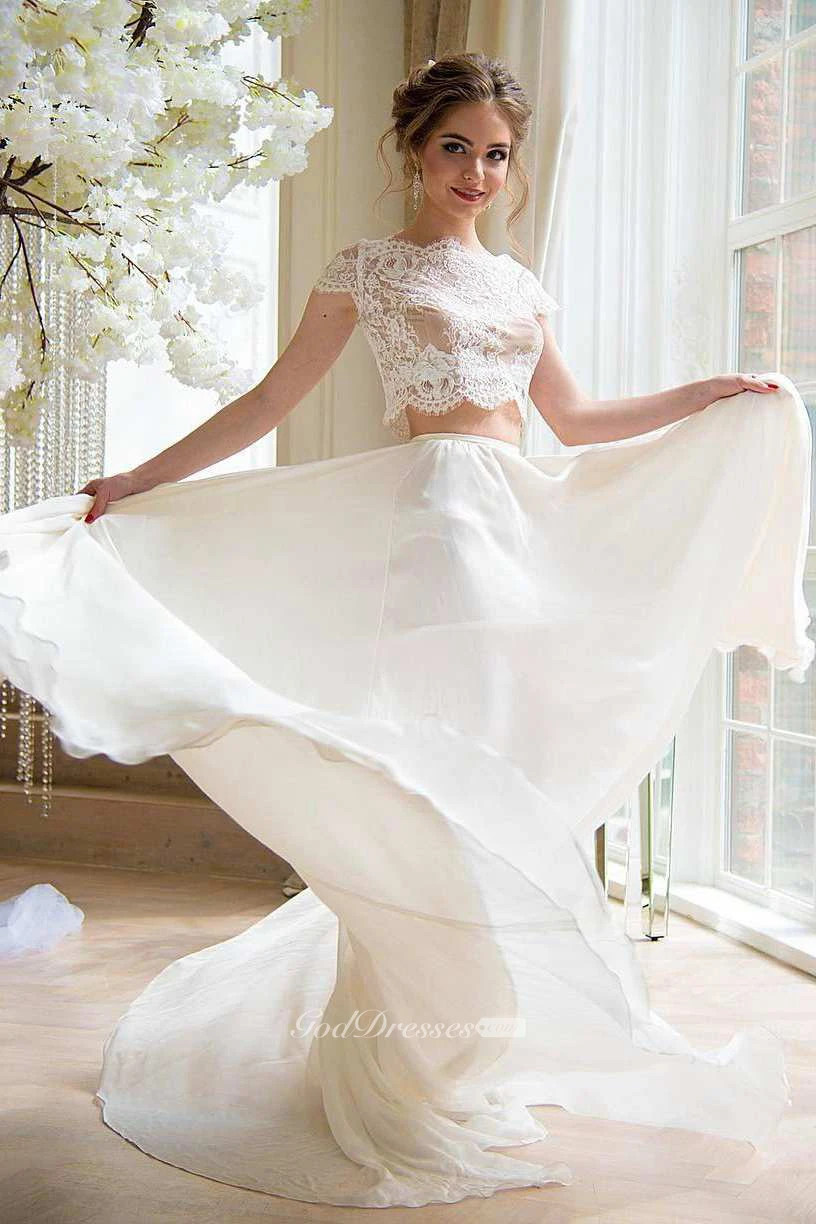 Bateau Short Sleeve Two-Piece Chiffon Wedding Dress With Lace Top