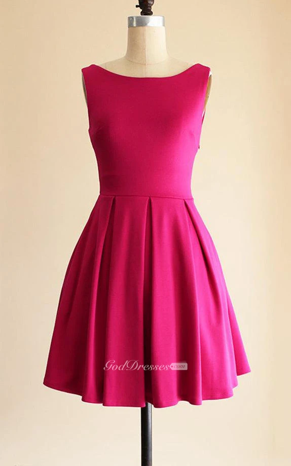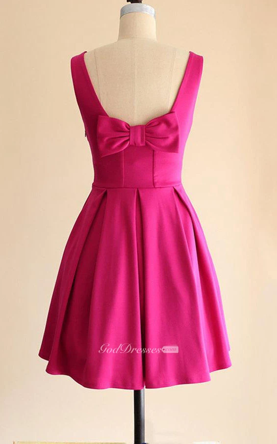Bateau Sleeveless A-line Pleated Satin Knee Length Dress With Bow