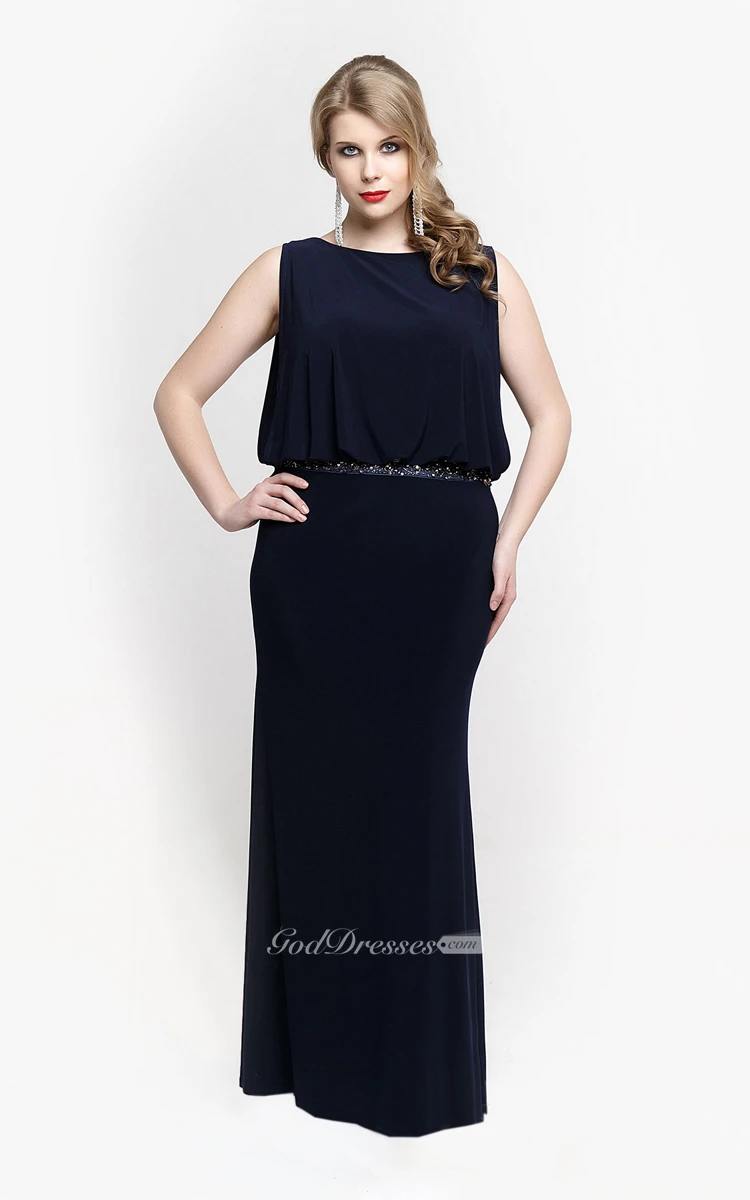 Bateau Sleeveless Sheath Jersey Long Dress With Blouson Bodice