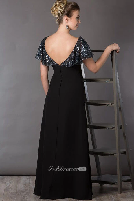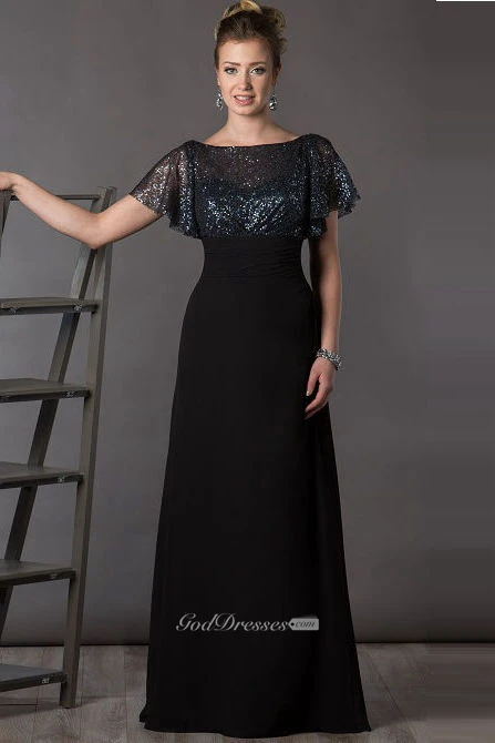 Bateau V Back Sequin Top Chiffon Long Mother Of The Bride Dress With Short Batwing Sleeve