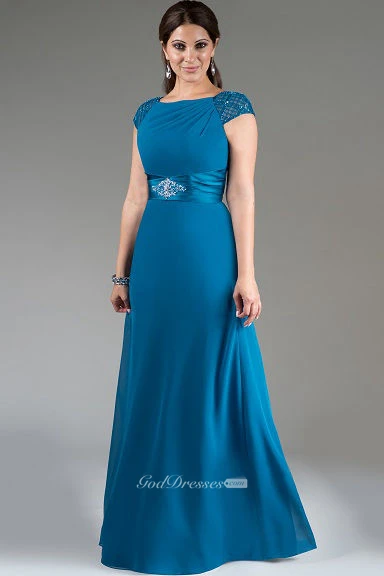 Beaded Cap Sleeve A-Line Long Mother Of The Bride Dress With Crystal Satin Sash