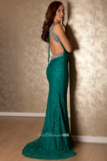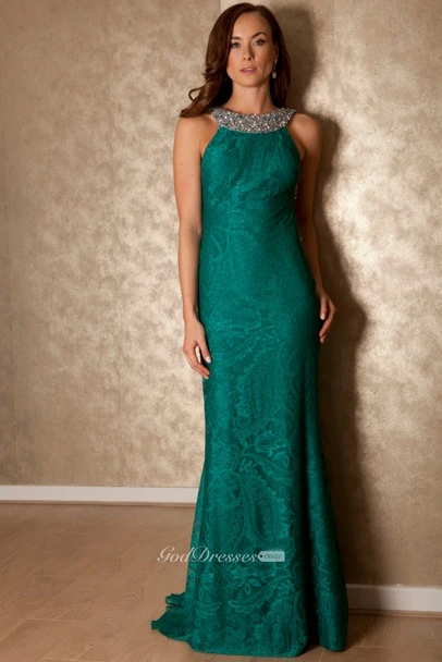 Beaded High Neck Sleeveless Lace Prom Dress With Brush Train