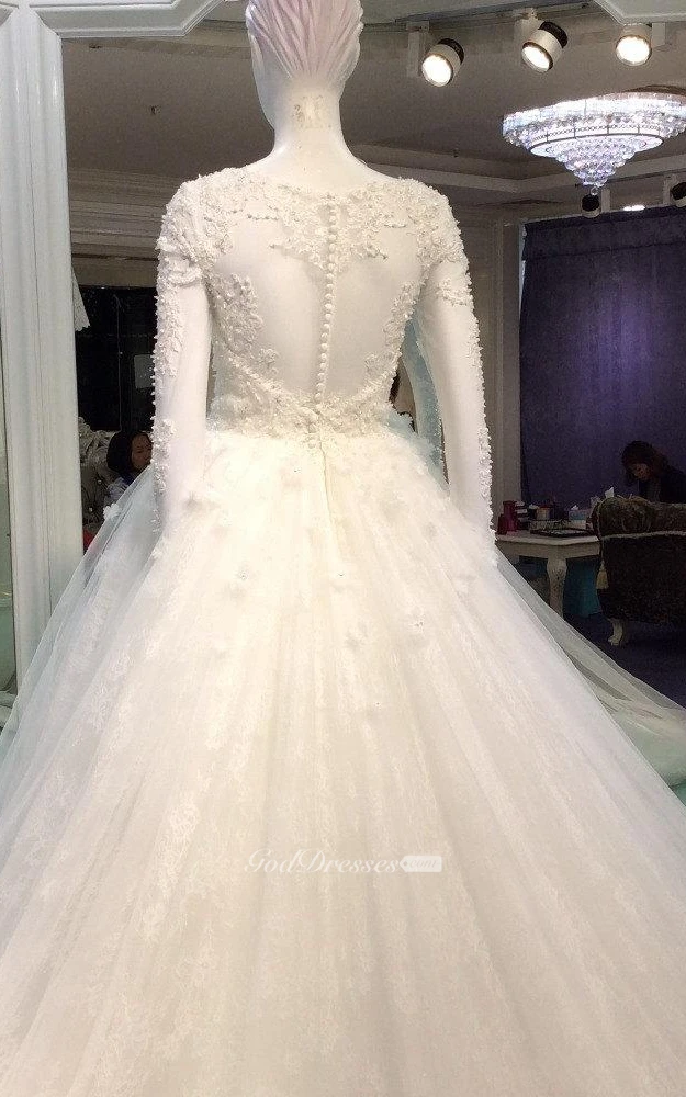 Beaded Lace A-Line Long Sleeve Dress With Illusion Back