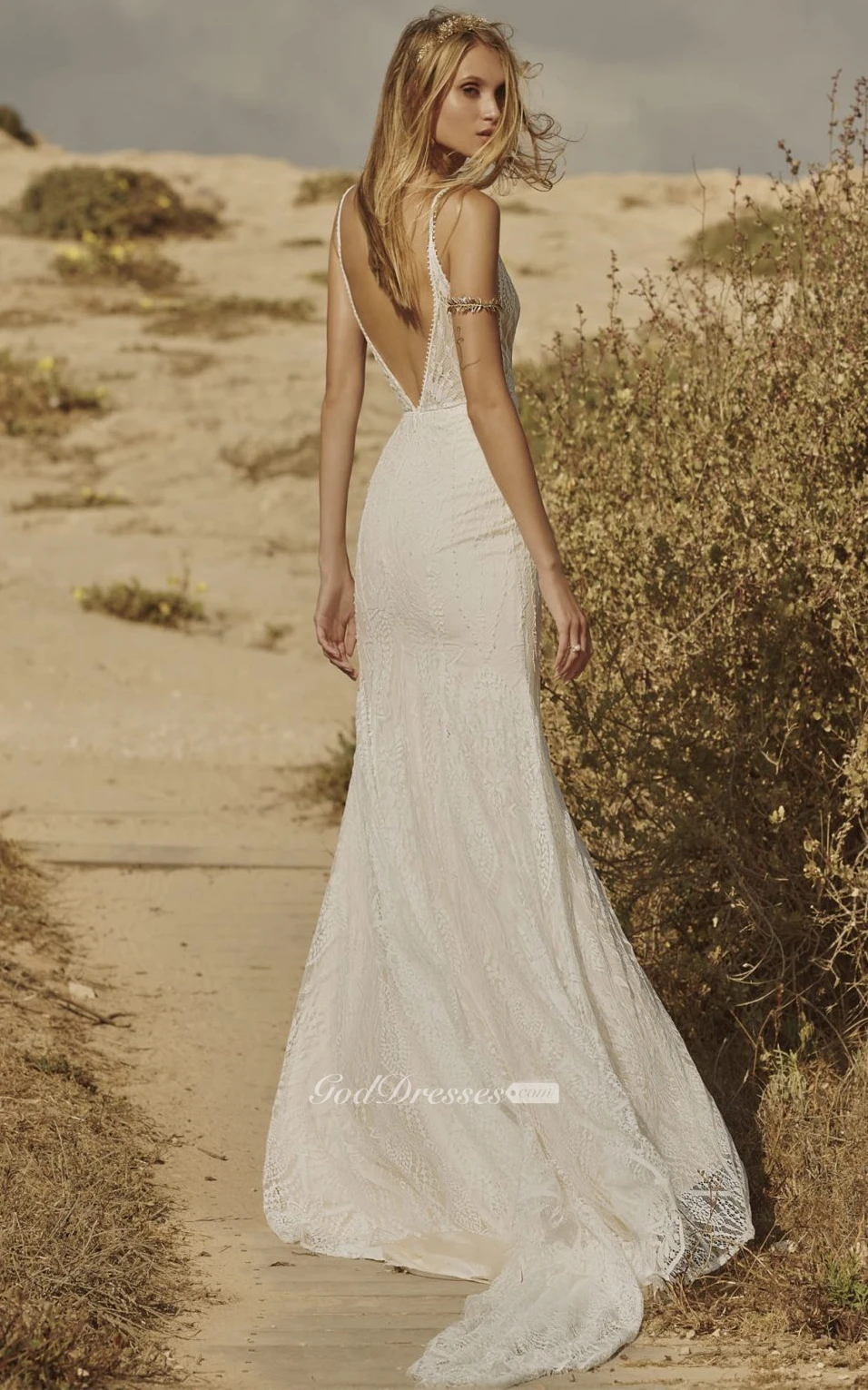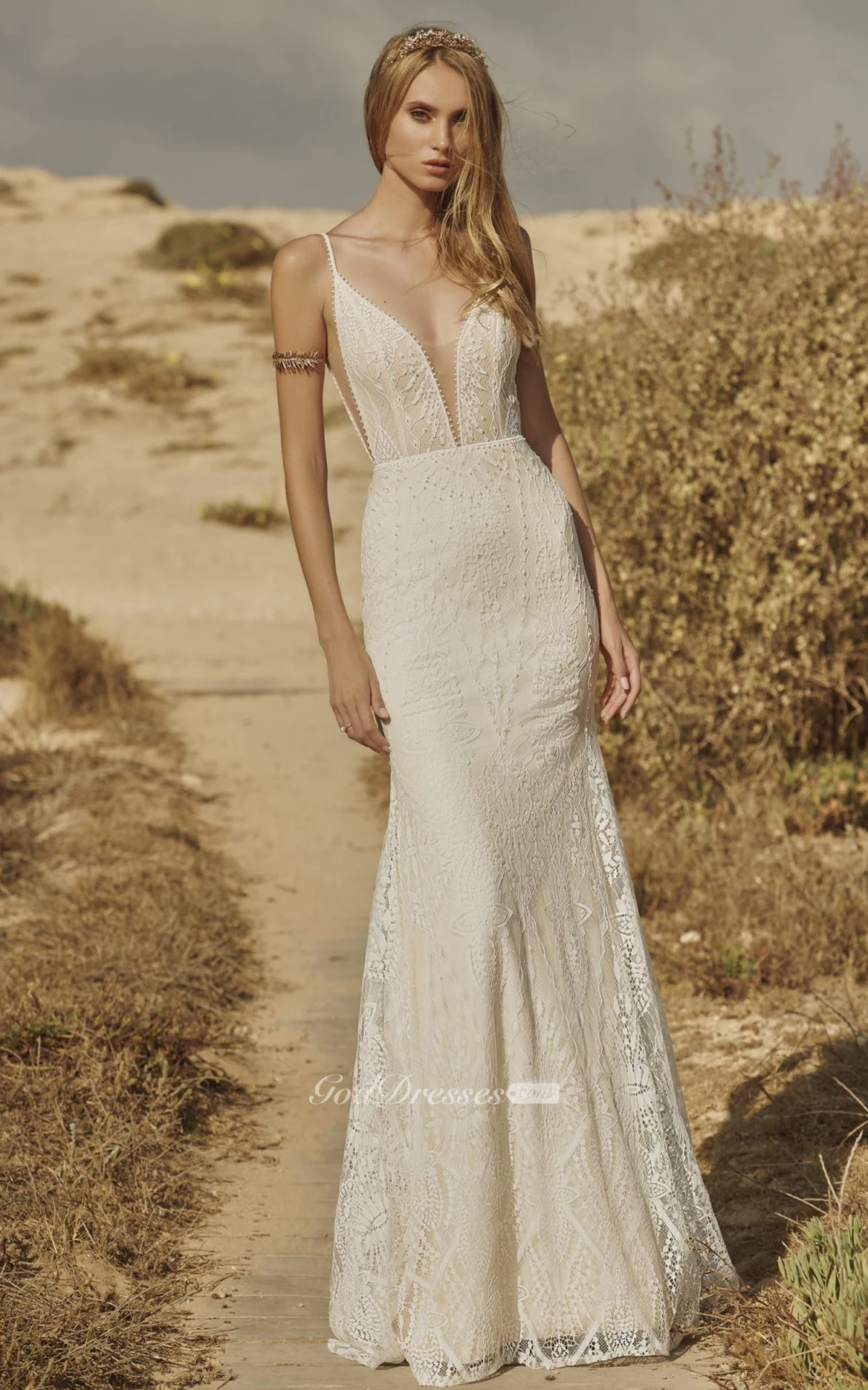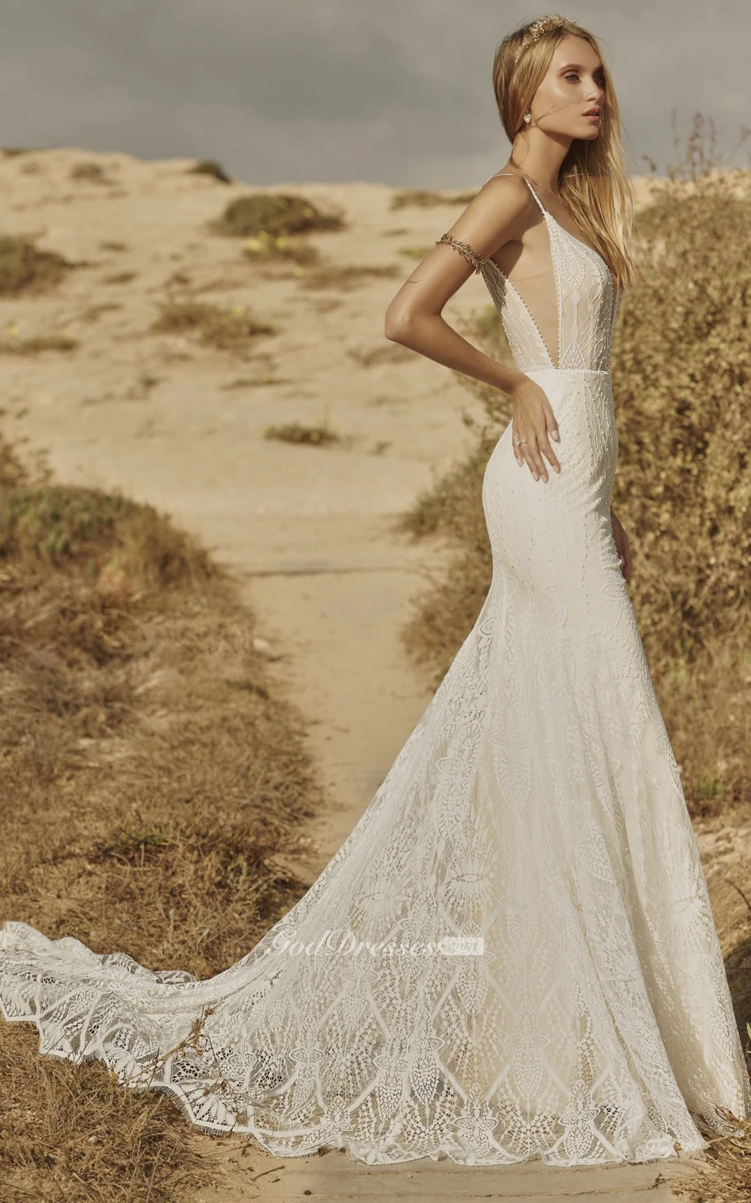 Beautiful Mermaid Lace Plunging Neckline Wedding Dress with Appliques