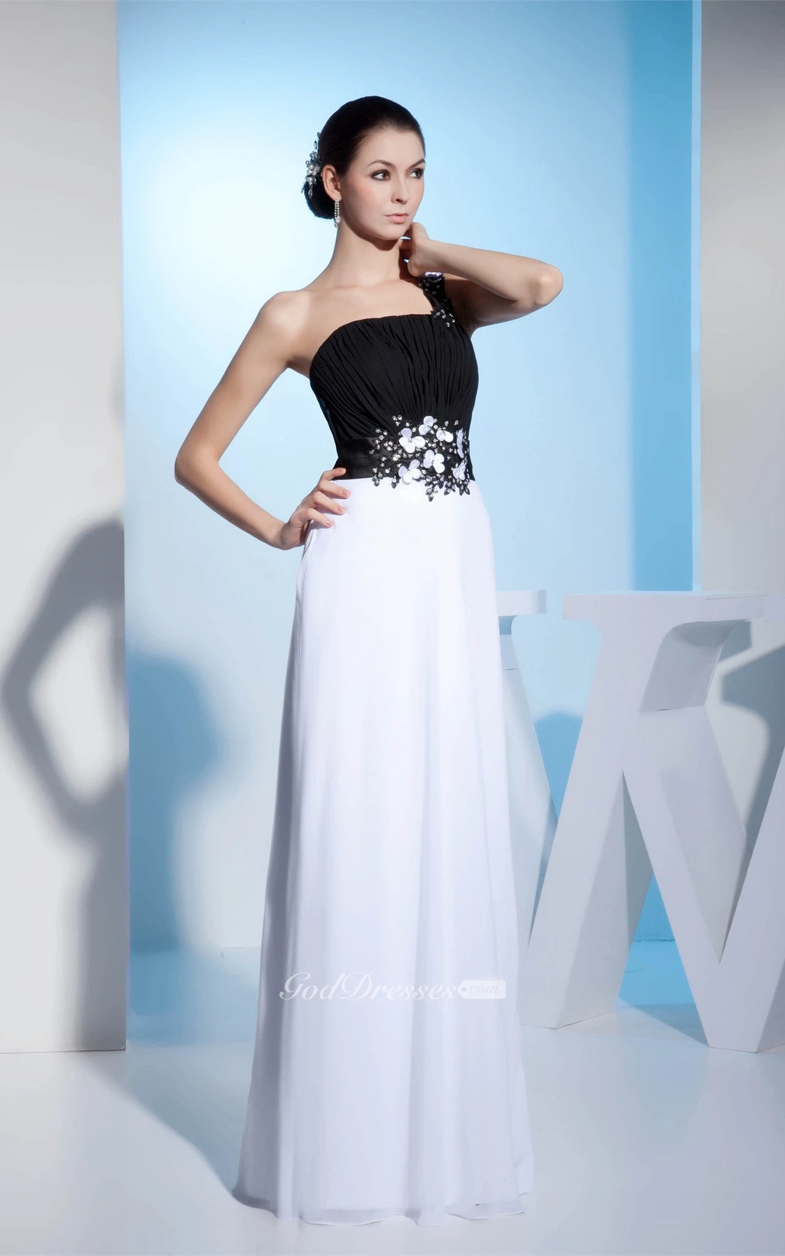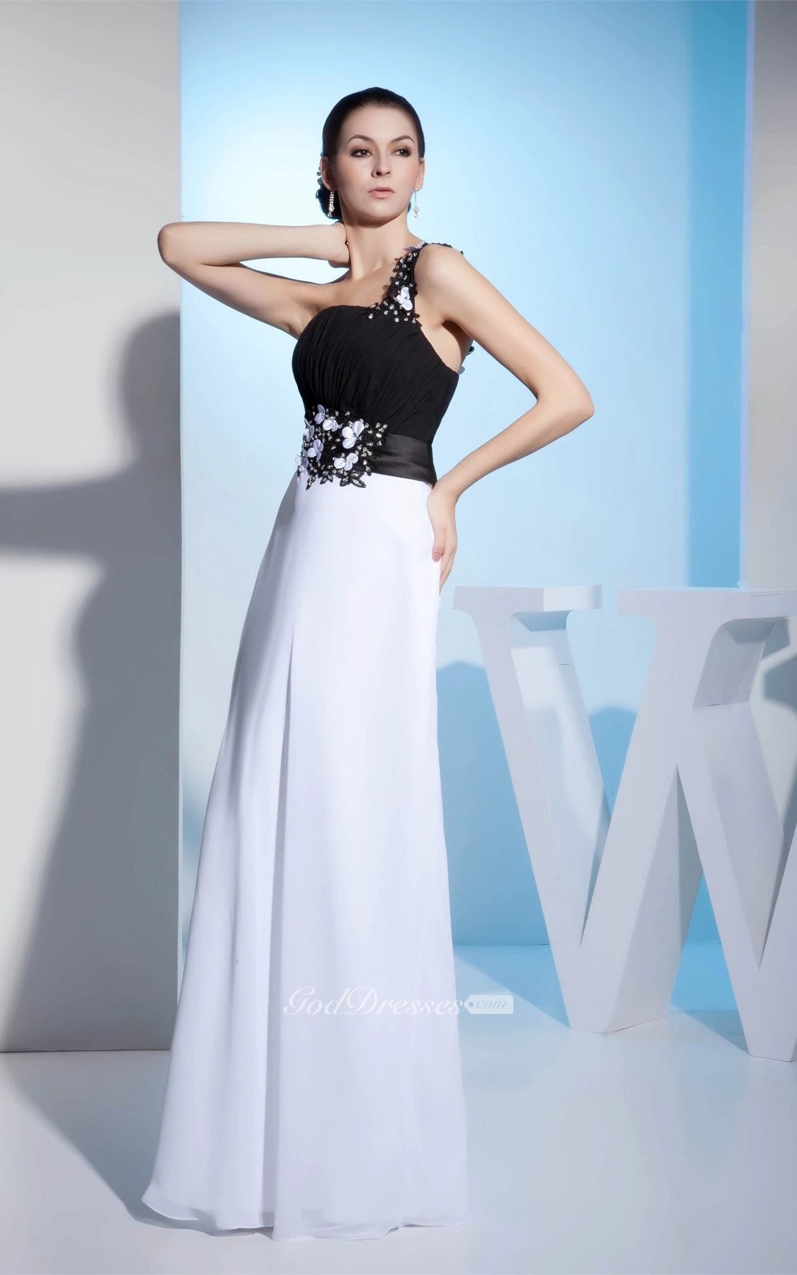 Black-And-White Floor-Length One-Shoulder Appliqued Waist and Dress With Ruching