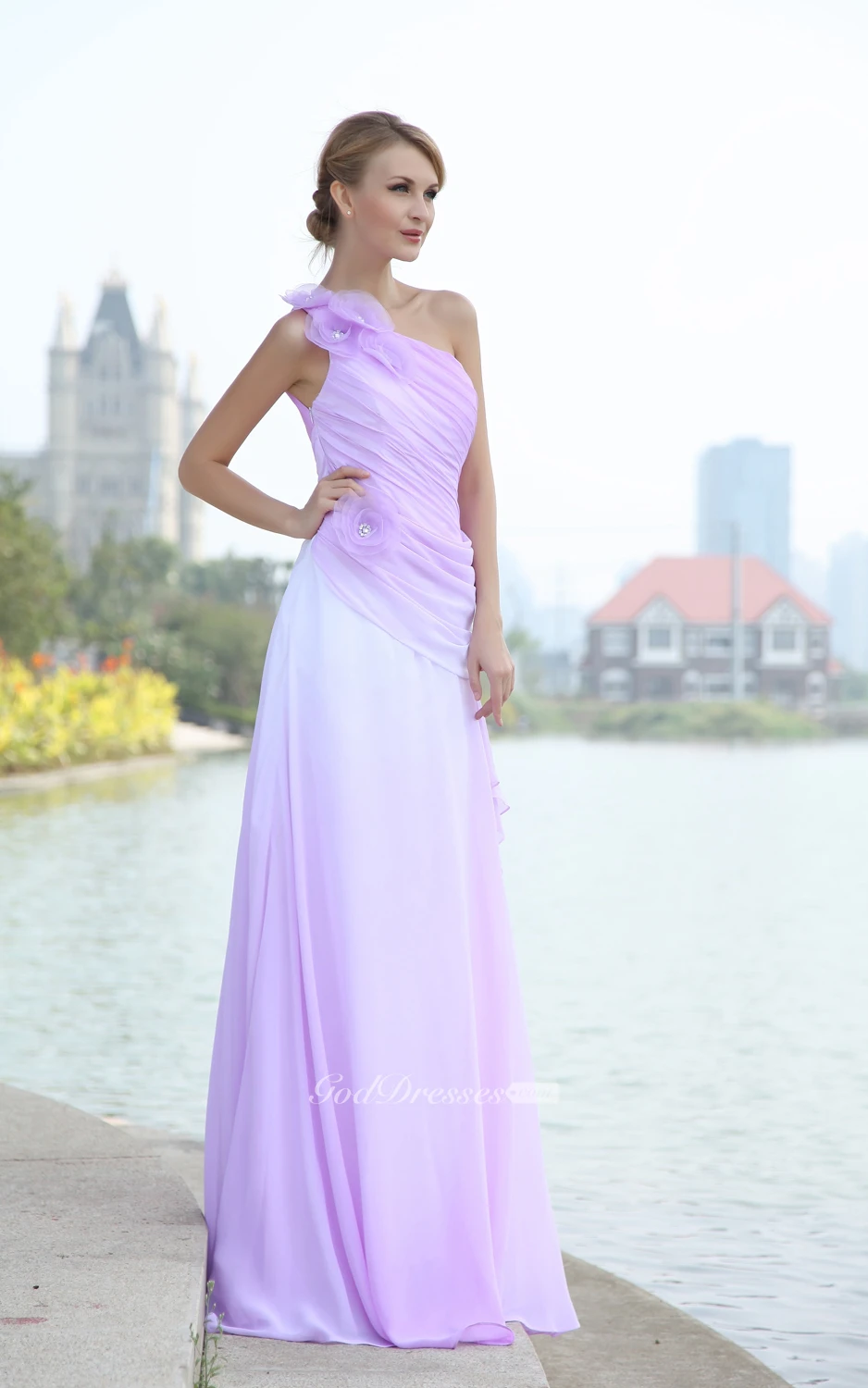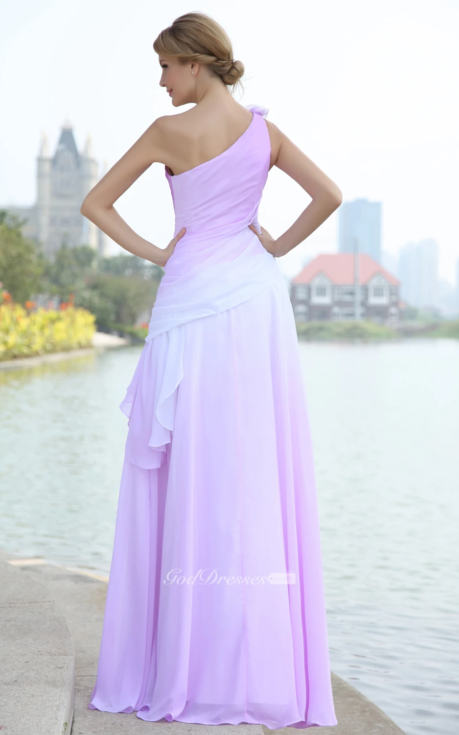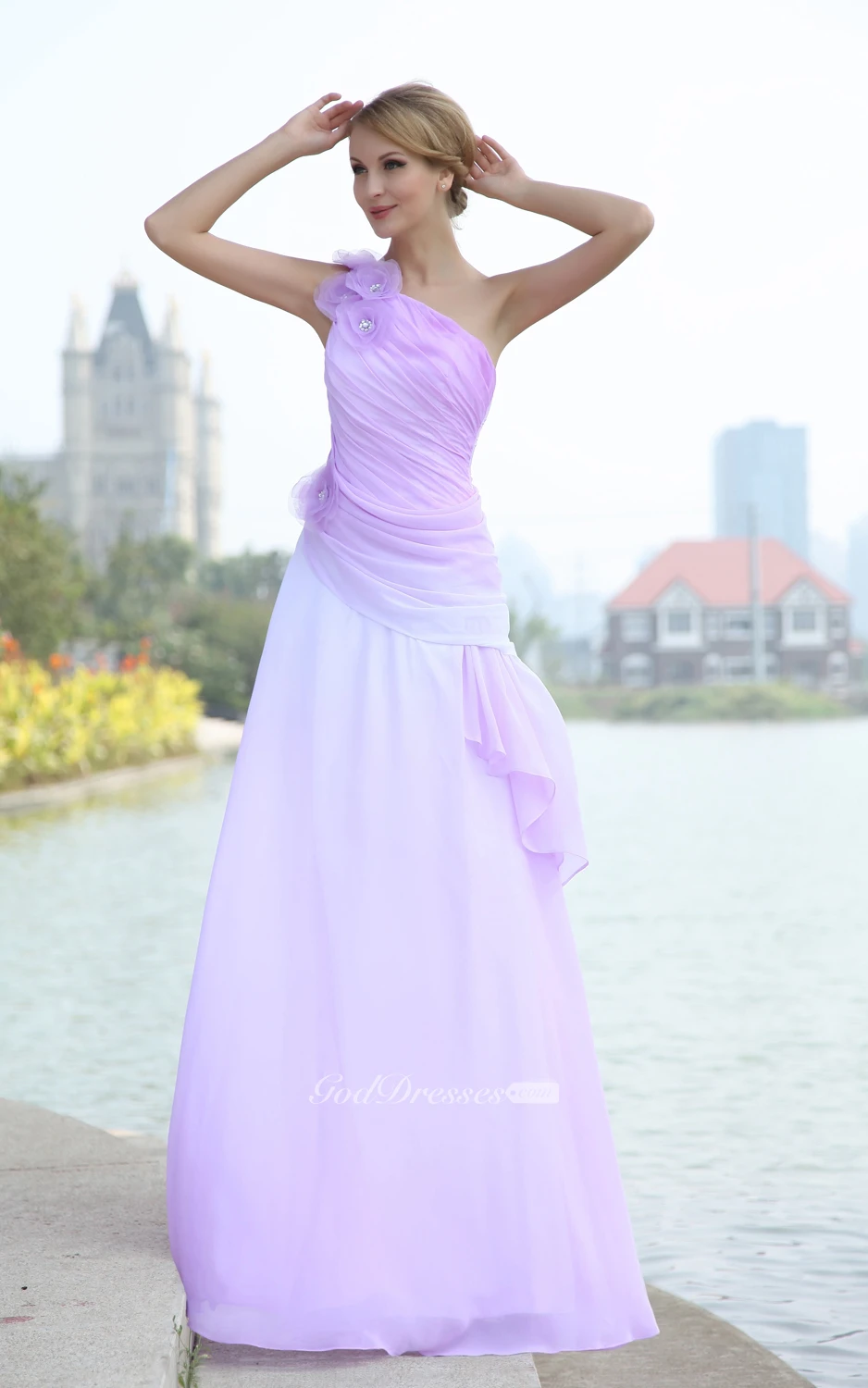 Blend Color Chiffon Floor-Length Dress With Pleating