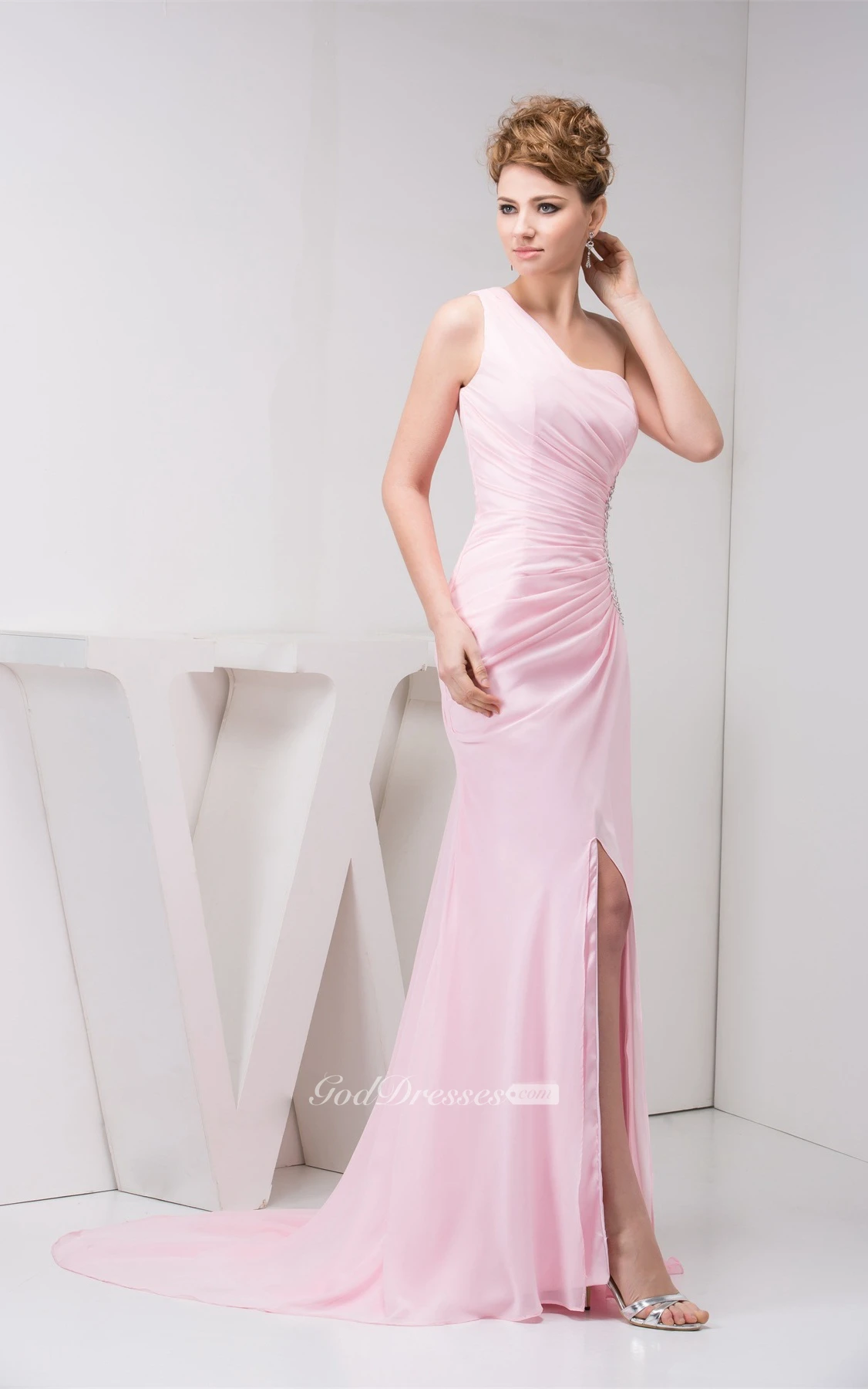 Blushing Front-Split One-Shoulder Sweep Train and Dress With Keyhole