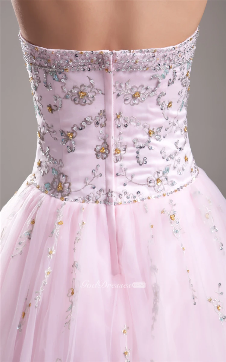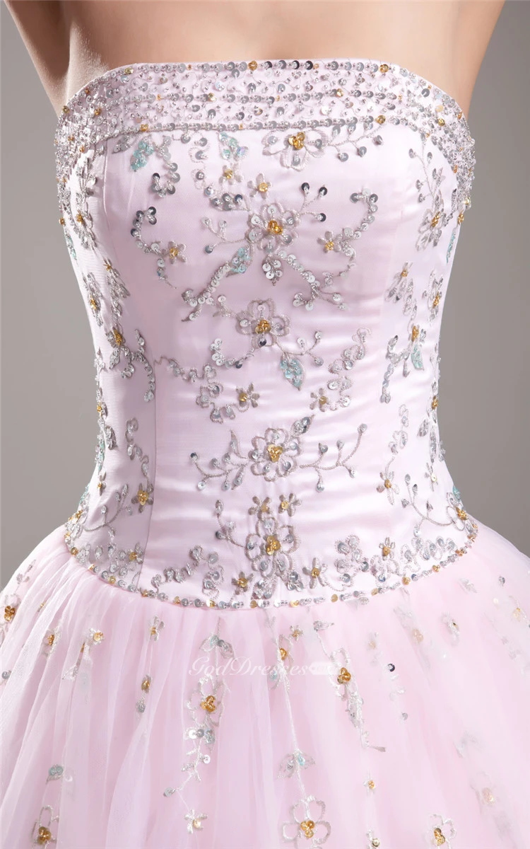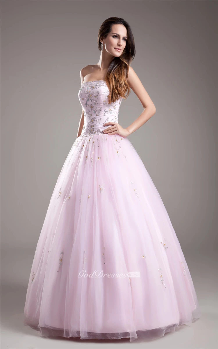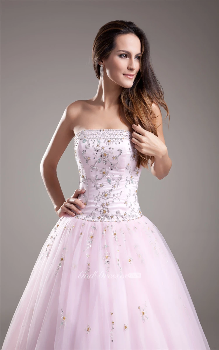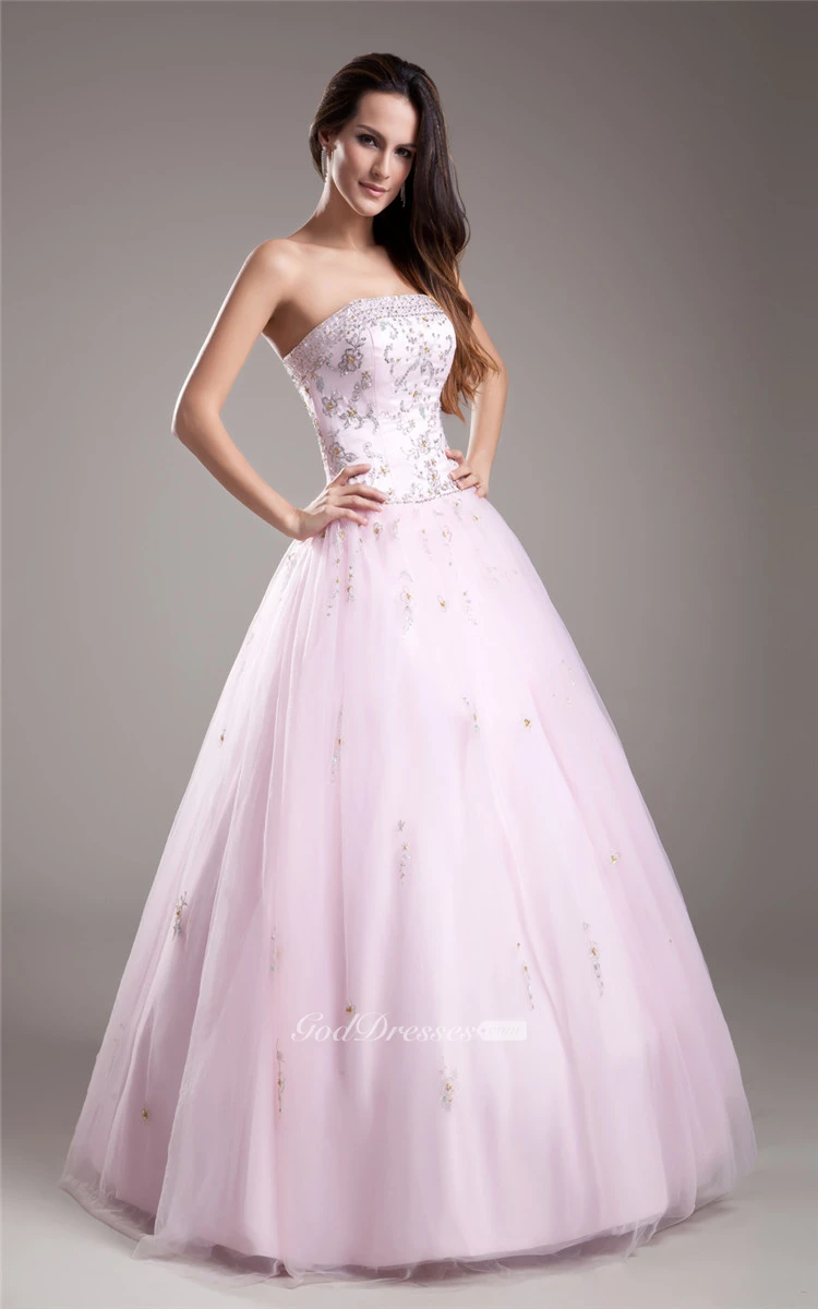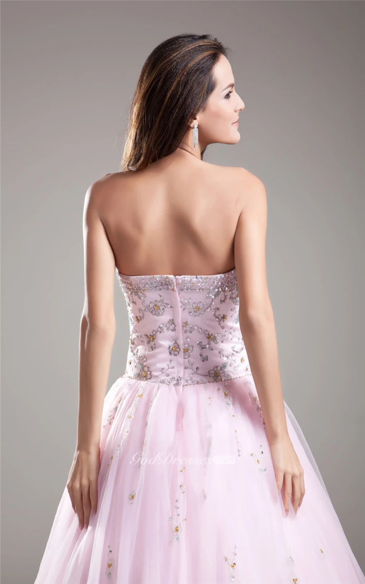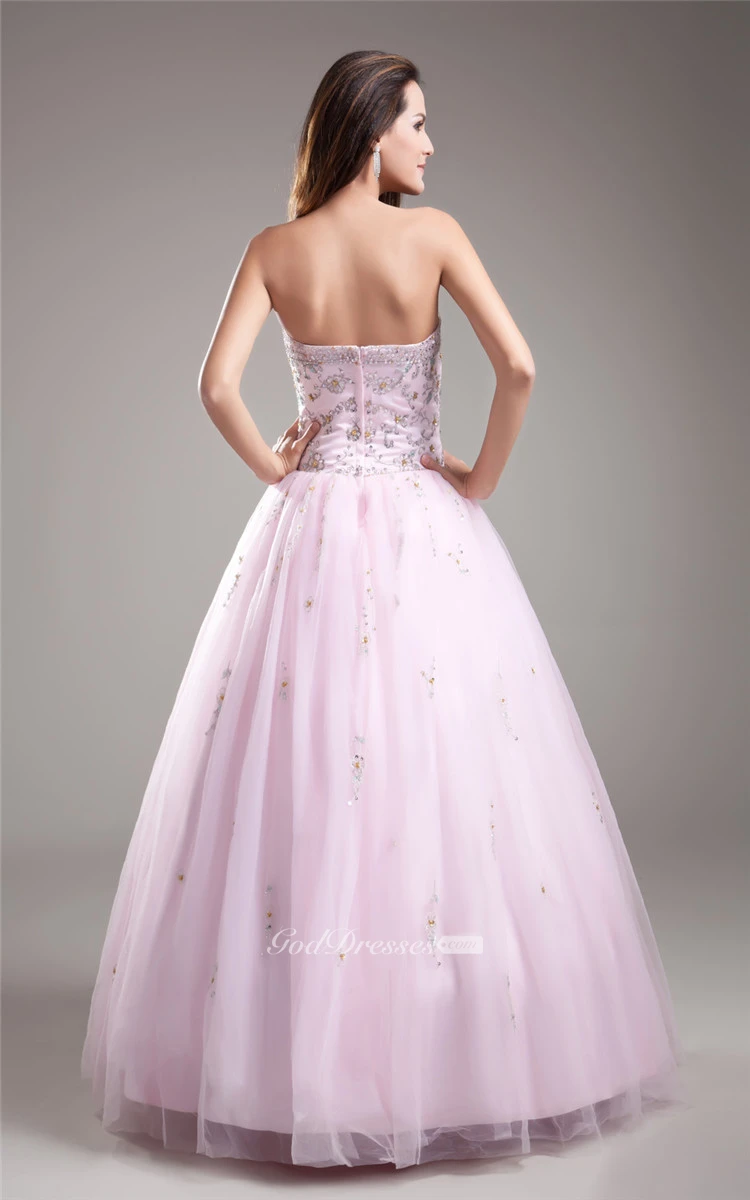 Blushing Strapless Beaded Ball Gown With Tulle Overlay