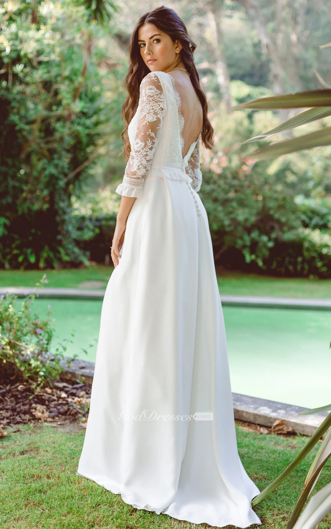 Bohemian 3/4 Length Sleeve Floor-length Chiffon A Line Wedding Dress with Appliques