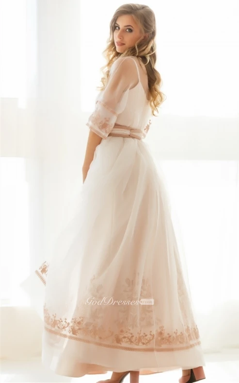 Bohemian A Line Bateau Ankle-length Prom Dress with Sash