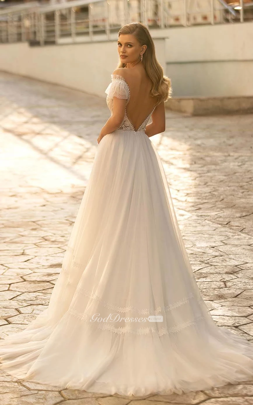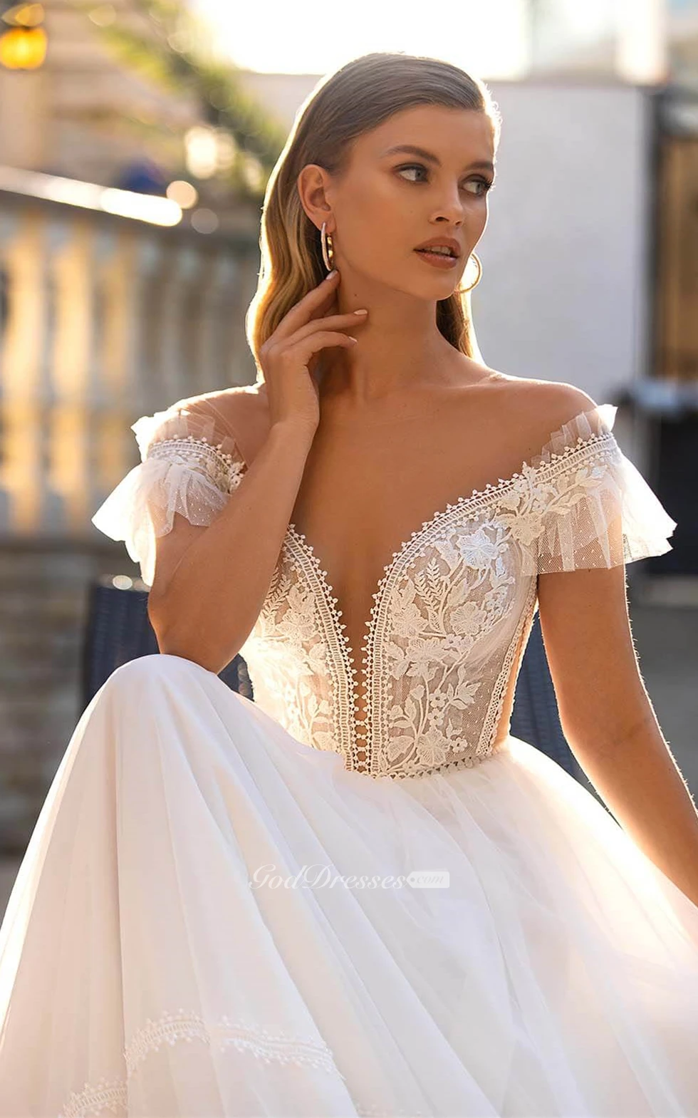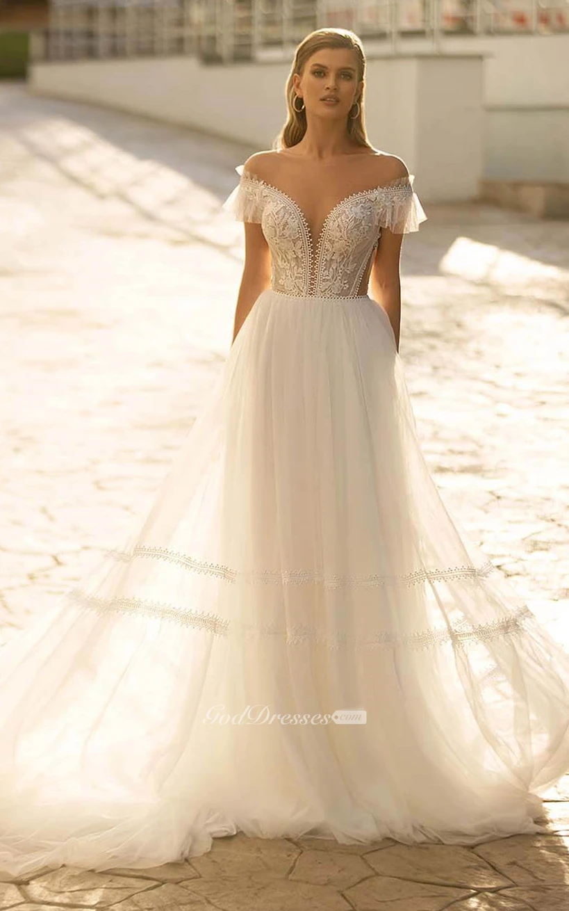 Bohemian A Line Lace V-neck Court Train Wedding Dress with Appliques