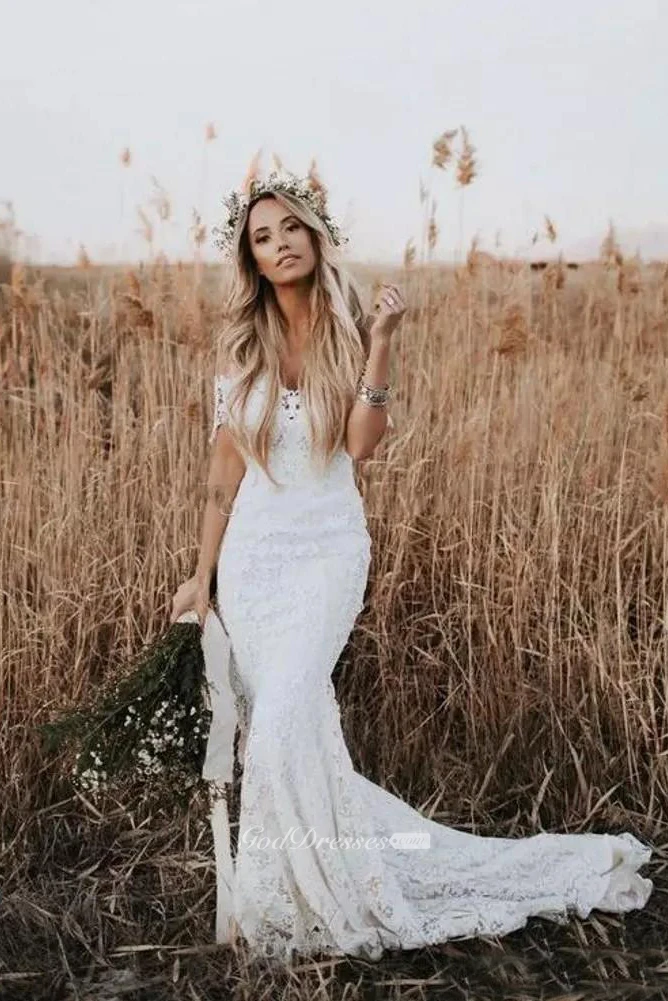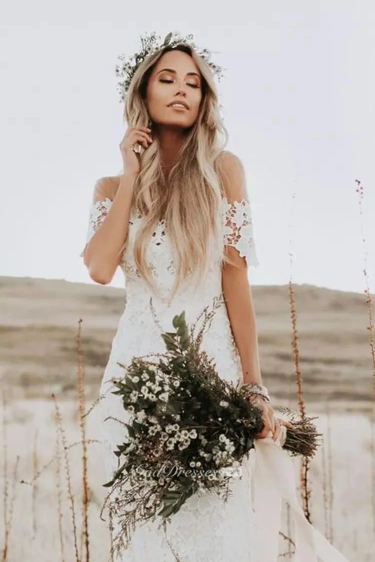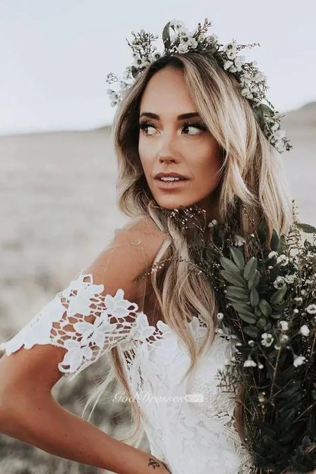 Bohemian Country Style Lace Off-the-shoulder Short Sleeve Wedding Dress