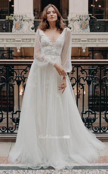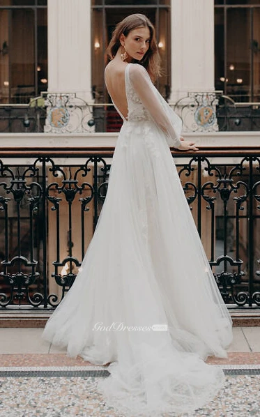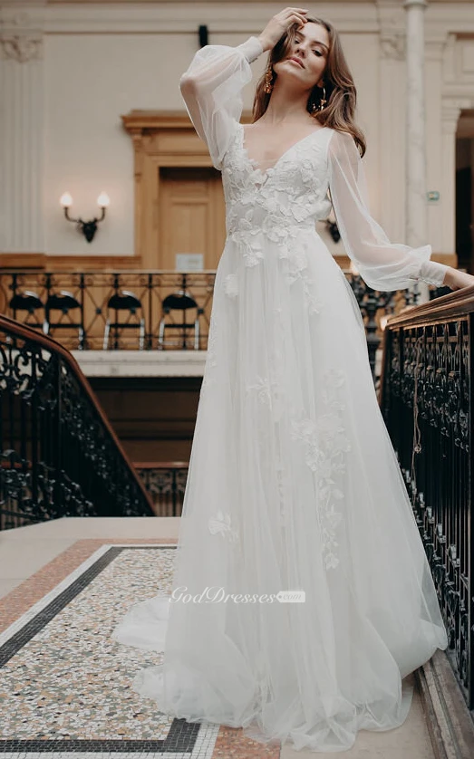 Bohemian Lace Floor-length Train Long Sleeve A Line Deep-V Back Wedding Dress with Appliques