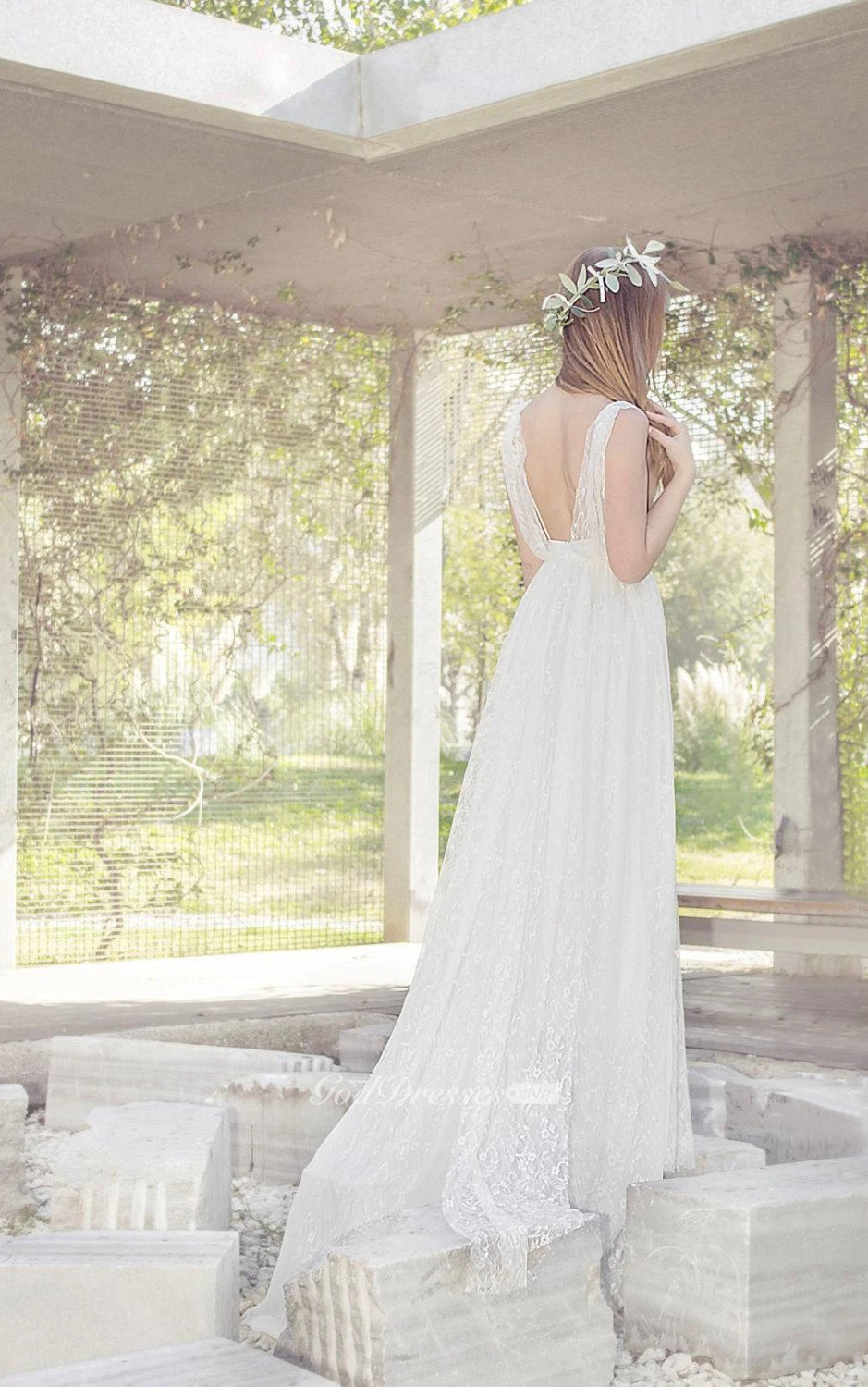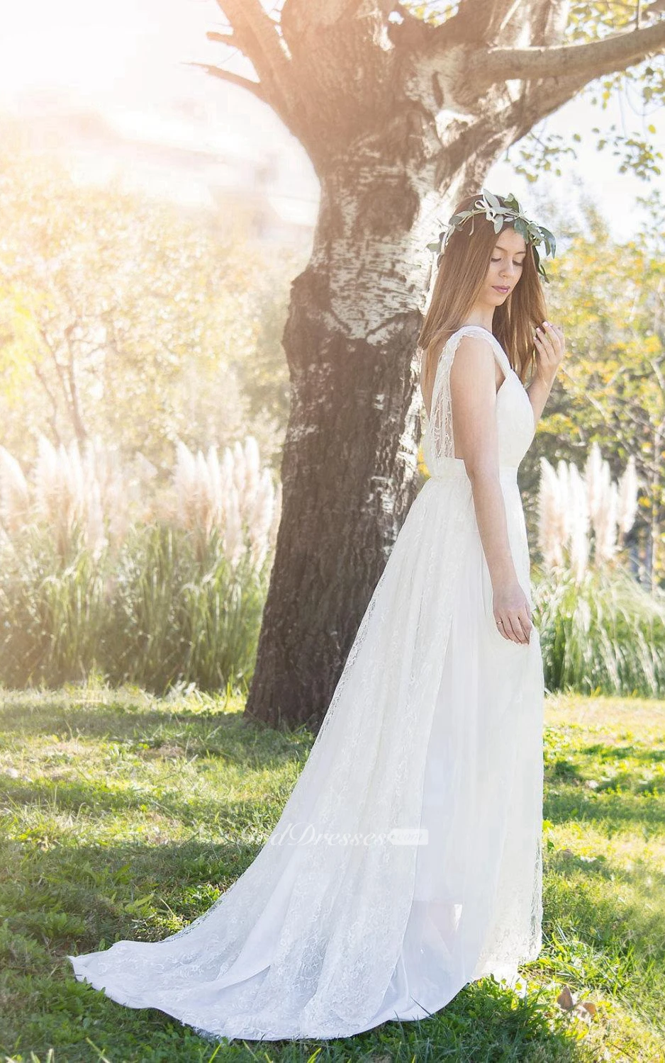 Bohemian Lace V-Neck A-Line Bridal Gown With Pleats