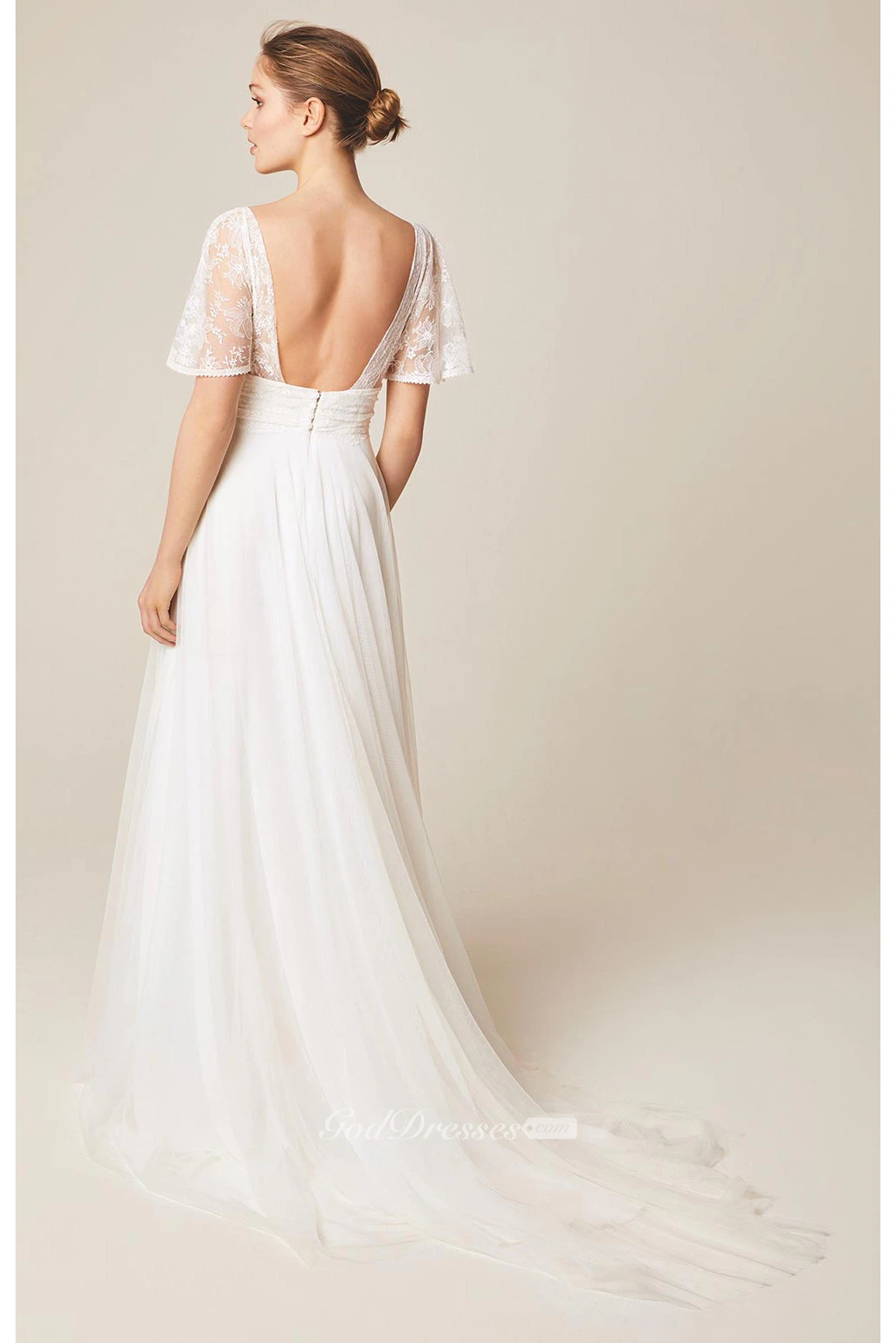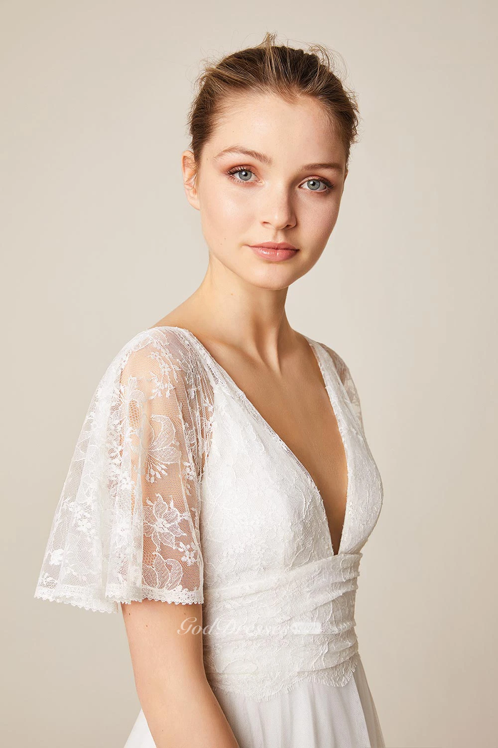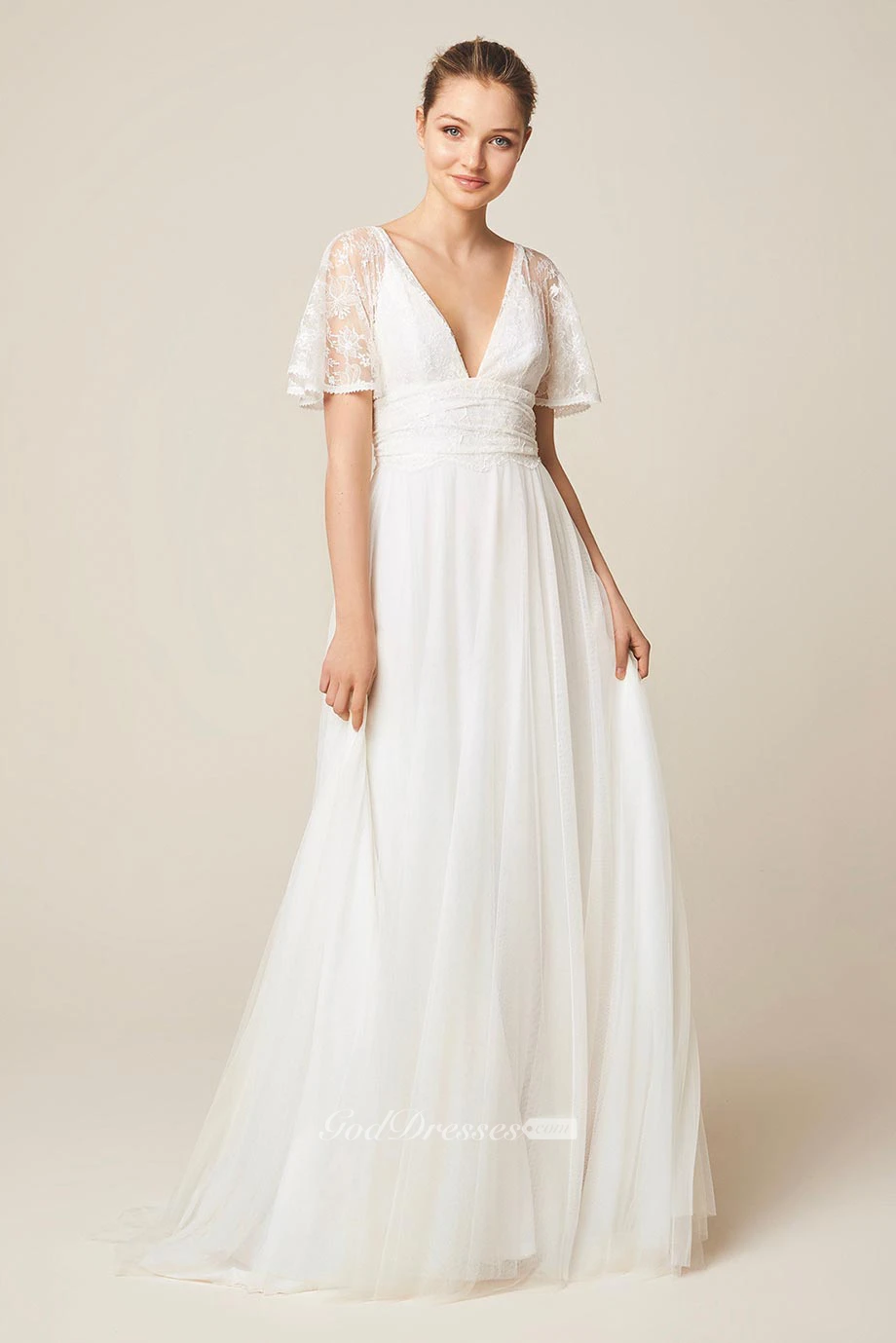 Brilliant V-neck Short Sleeve Lace And Tulle Wedding Dress