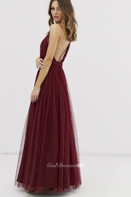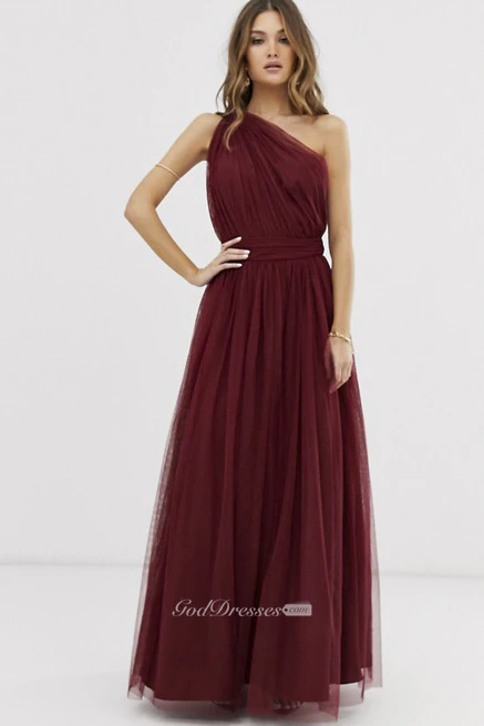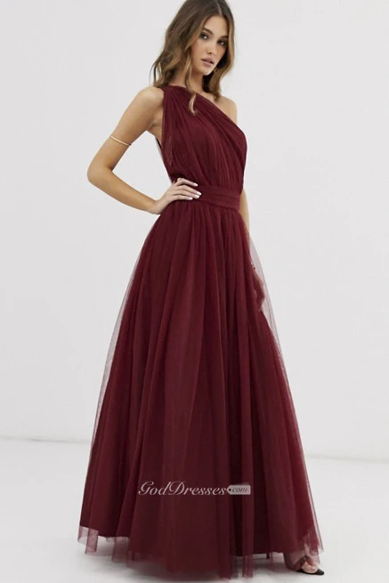Burgundy Tulle One Shoulder And Open Back Bridesmaid Dress With Ruching