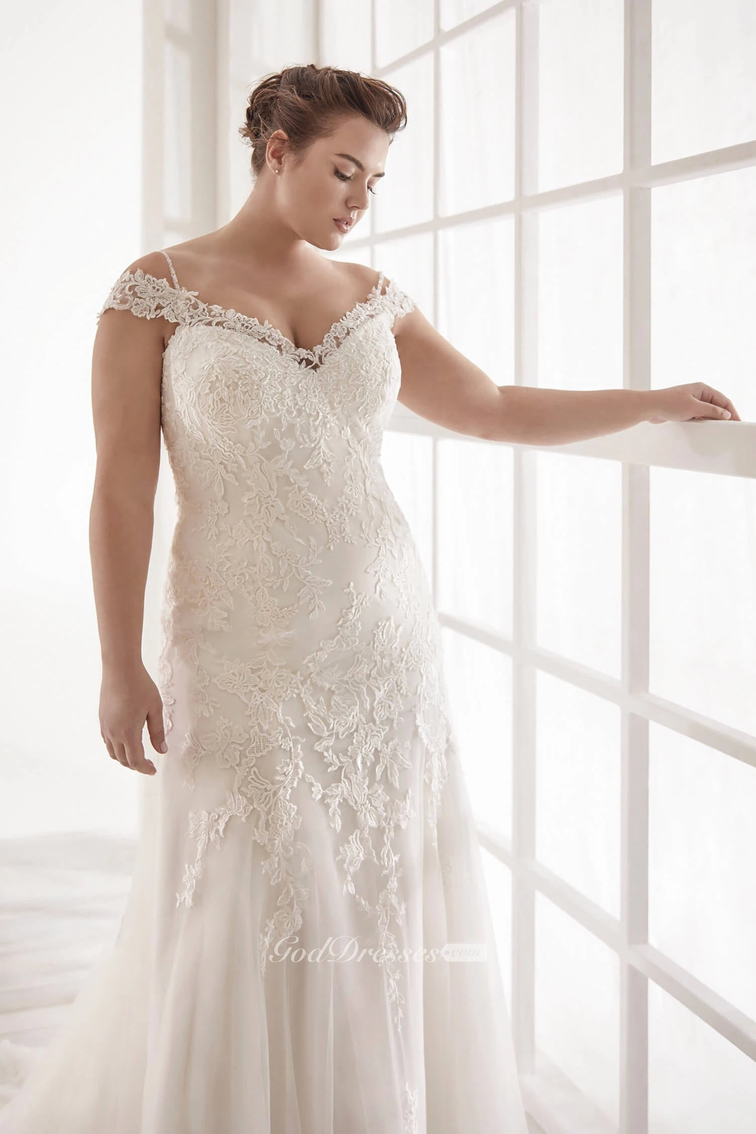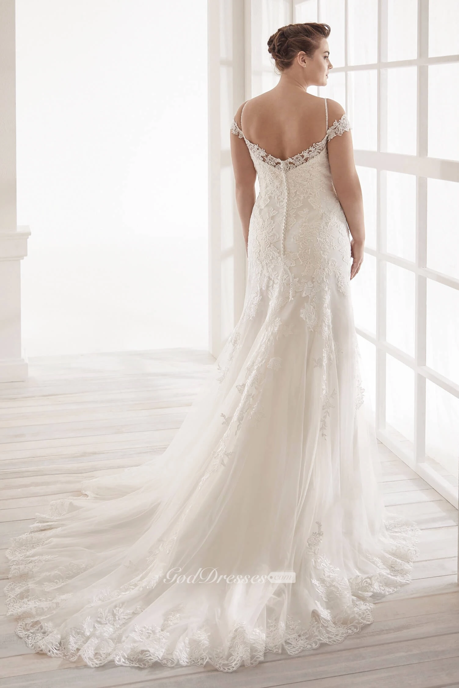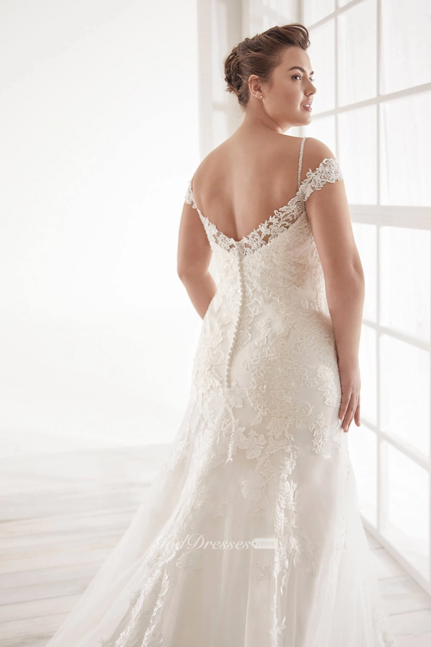 Buttons V-back Off-the-shoulder Sexy Trumpt Lace Wedding Dress With Straps