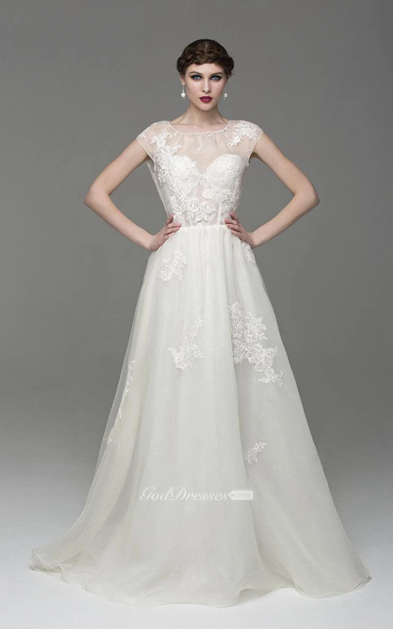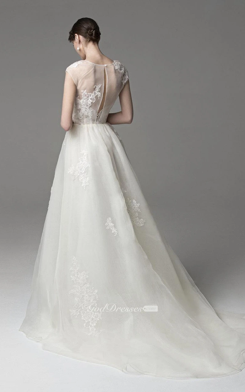 Cap Sleeve A-Line Lace-Appliqued Tulle Dress With Bateau Neck and Keyhole Back