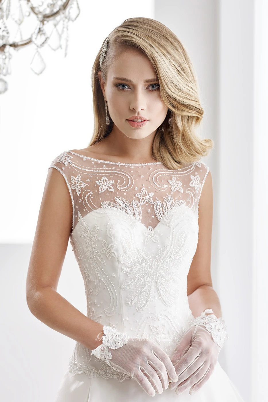 Cap Sleeve A-Line Stain Bridal Gown With Lace Bodice And Illusive Design