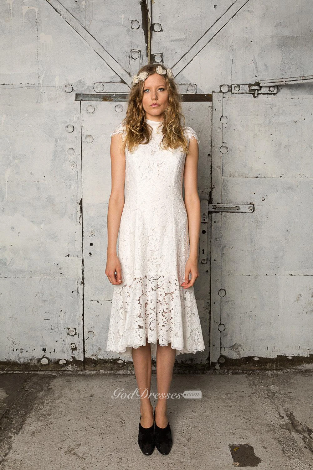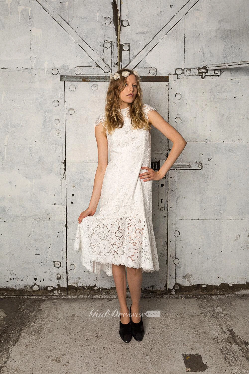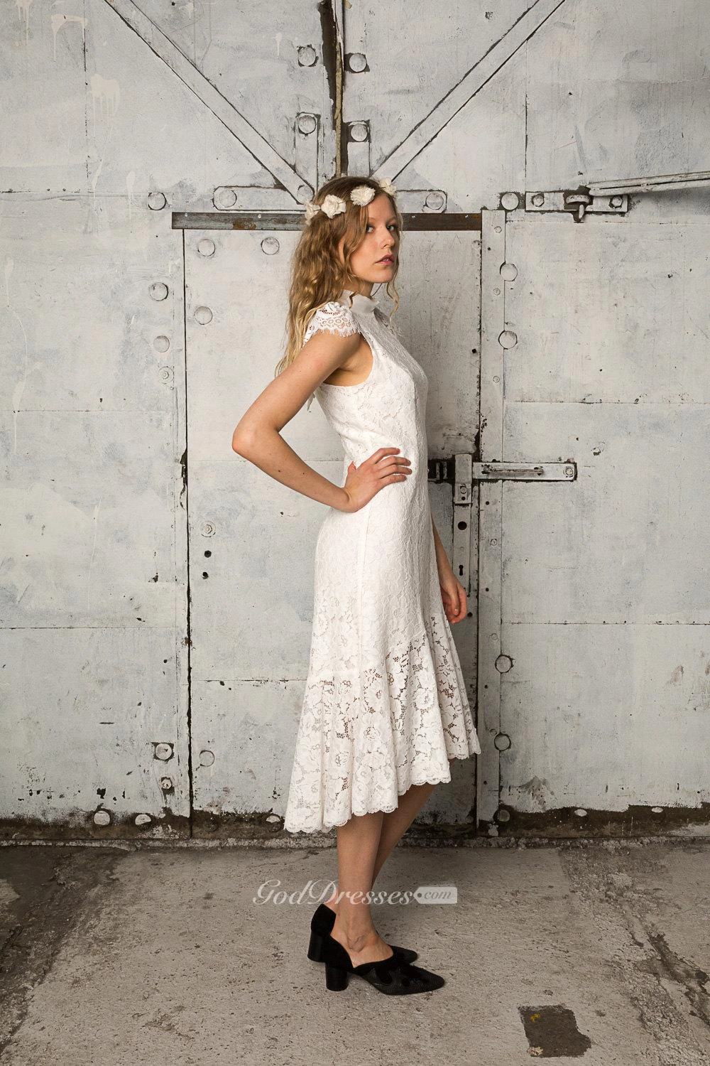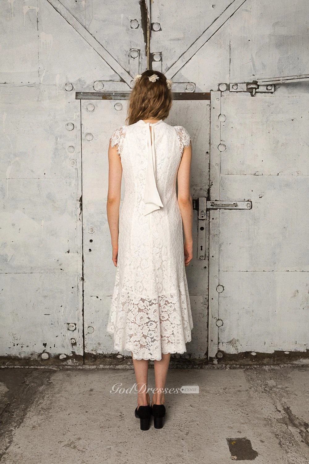 Cap Sleeve Column Tea Length Lace Gown With Pleats