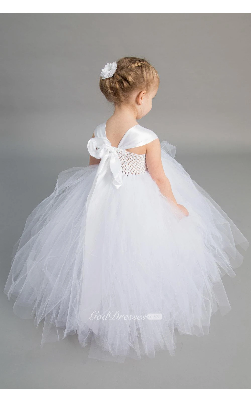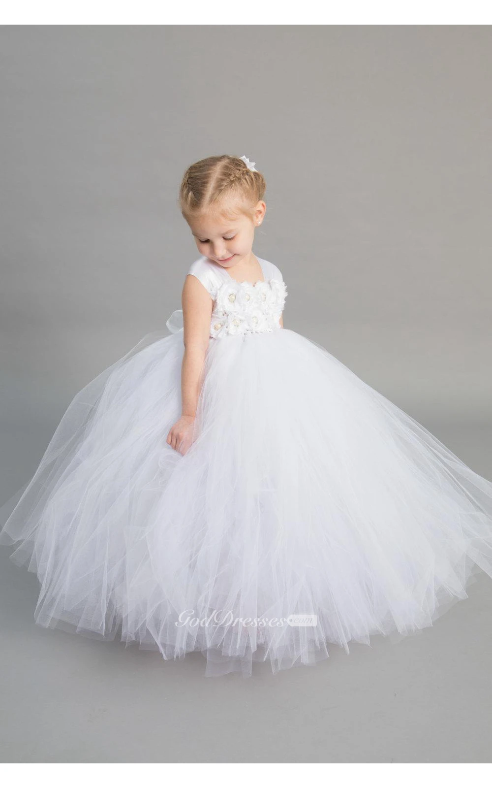 Cap Sleeve Floral Top Tiered Tulle Ball Gown With Sash